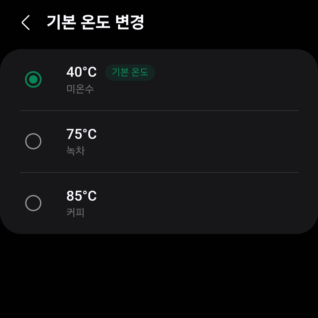 온수 온도 설정도 해볼까요? 기본으로 설정되어 있는 75도 온도를 바꾸고 싶다면 [기본 온도 변경]을 클릭 후 원하는 온도를 선택해 주면 되는데요. 저희 가족은 미온수를 많이 먹어 기본 온도 설정을 40도인 미온수로 설정해 놓았고 정수기에서 온수를 누르면 40도인 미온수가 나온 답니다.
