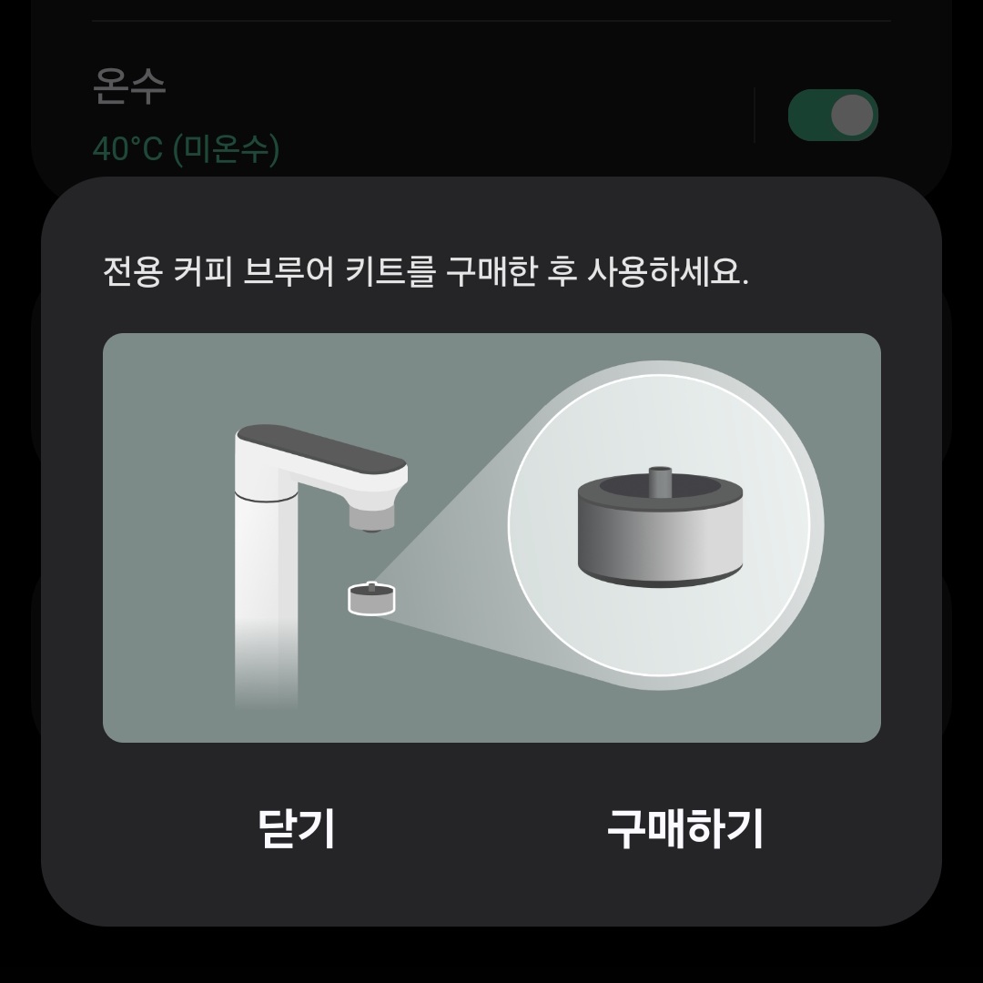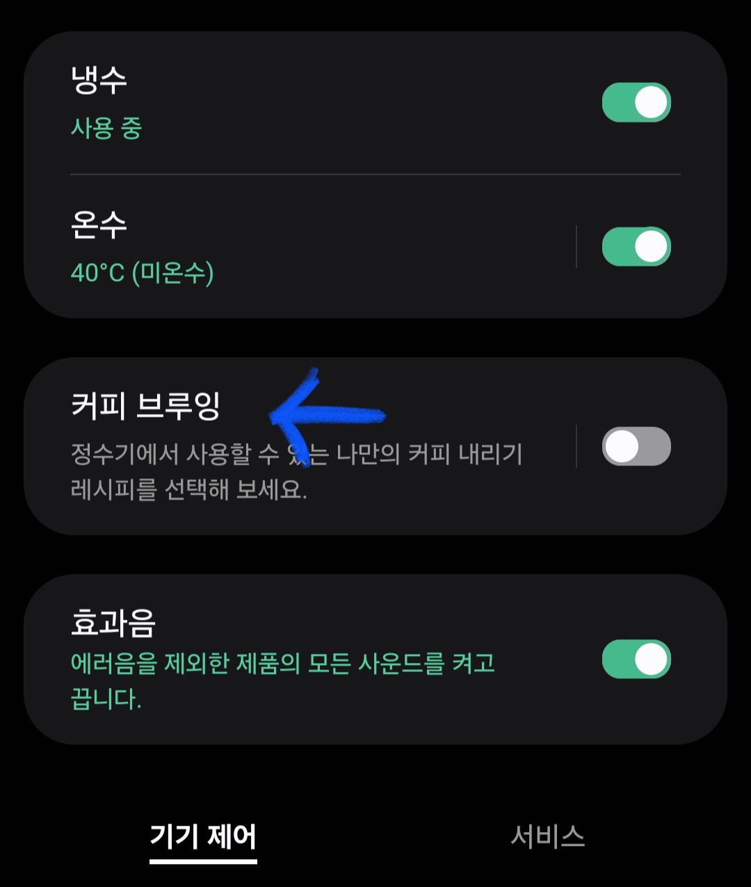 ▼스마트싱스에 구매한 비스포크정수기를 설정해 놓으면 위에 있는 설정 외에 커피를 즐겨드신다면 커피 브루잉기능으로 나만의 커피 내리기 기능도 있는데요. 저는 커피를 먹지 않아 활용하고 있진 않답니다.
