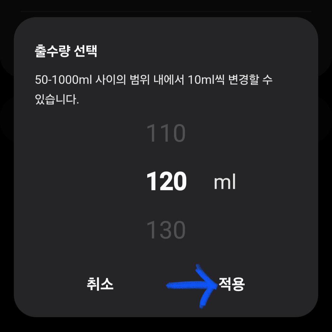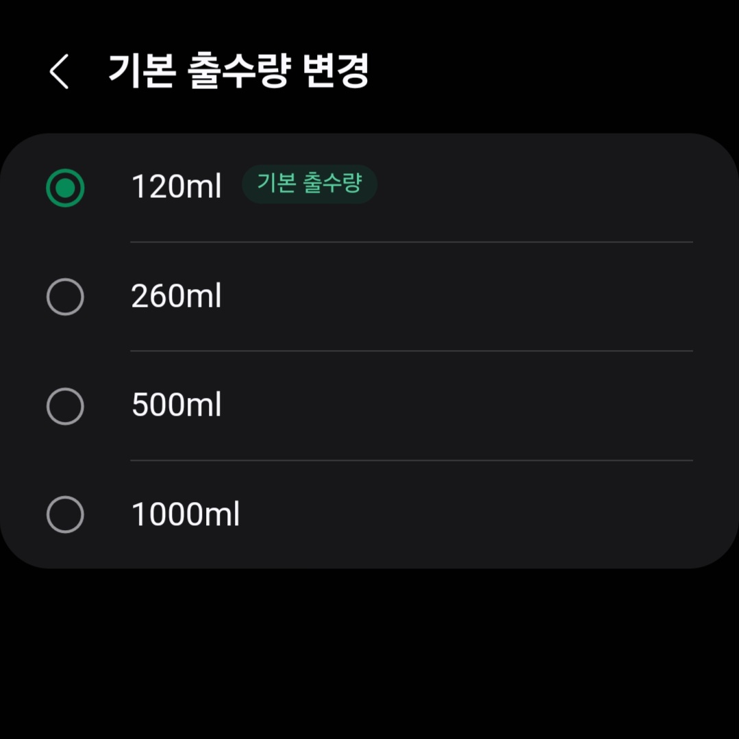 ▼그럼 기본으로 설정되어 있는 출수량을 바꿀 수 있는데요. 하단에 있는 [기본 출수량 변경]을 클릭하고 한번 물먹을 때 500ml를 먹는다면 500ml를 클릭 원하는 기본 출수량을 선택해 주시면 됩니다.