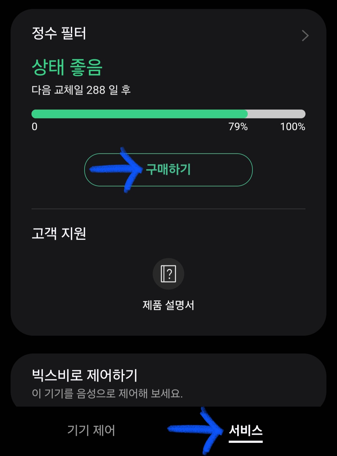 ▼그 외 하단 기기 제어에서 서비스를 클릭하면 정수 필터 수명도 확인할 수 있고 필터수명이 다했을 때 편하게 구매할 수도 있습니다.