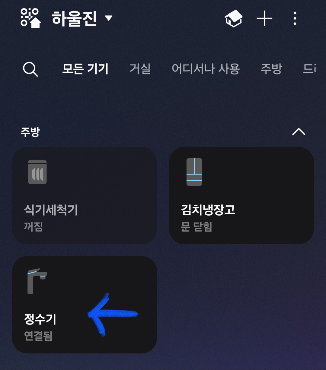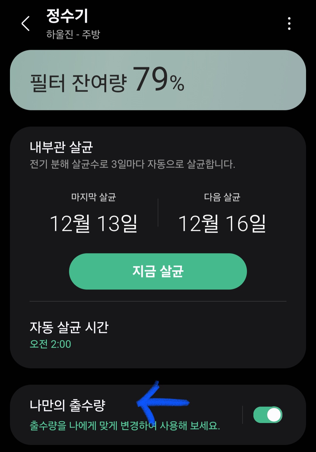 ▼스마트싱스를 실행 후 연동해 놓은 [정수기]를 클릭하고 그다음 [나만의 출수량]을 클릭해 주세요.