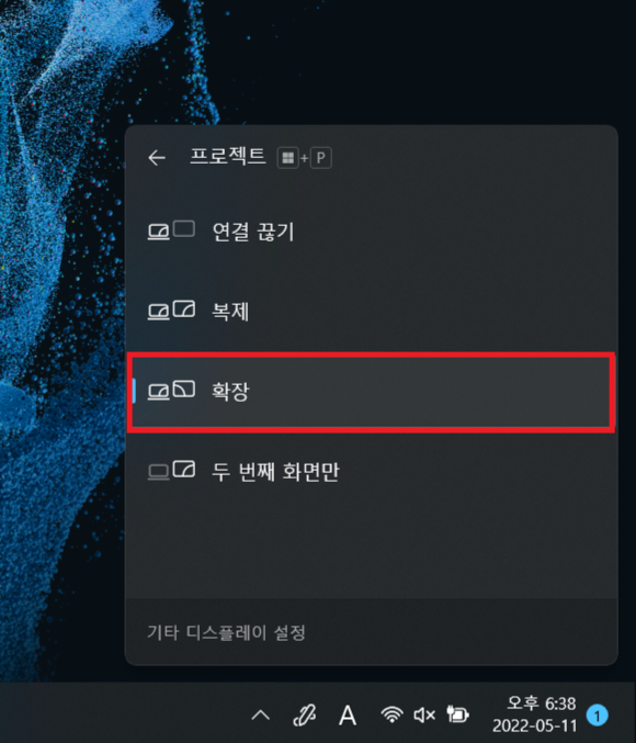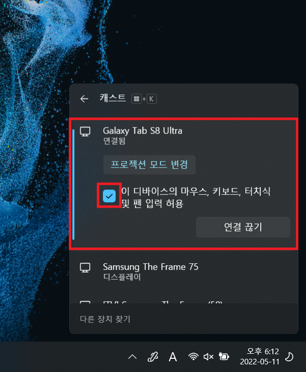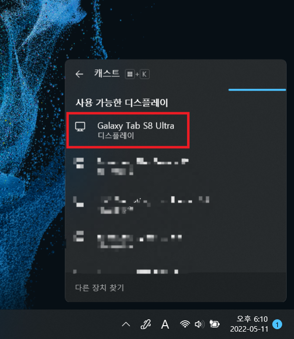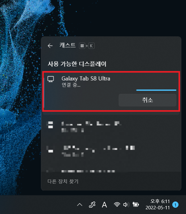 갤럭시탭을 위에 있는 화면으로 만들어 놓았다면 노트북 키보드 자판에서 윈도우 키 와 K 키를 누르면 작업표시줄 창 오른쪽에 새로운 창이 하나 뜨는데 거기서 사용 중인 갤럭시탭 이름을 찾아 클릭하면 세컨드 스크린 기능이 활성화되고 갤럭시탭을 듀얼 모니터로 사용할 수 있게 됩니다.