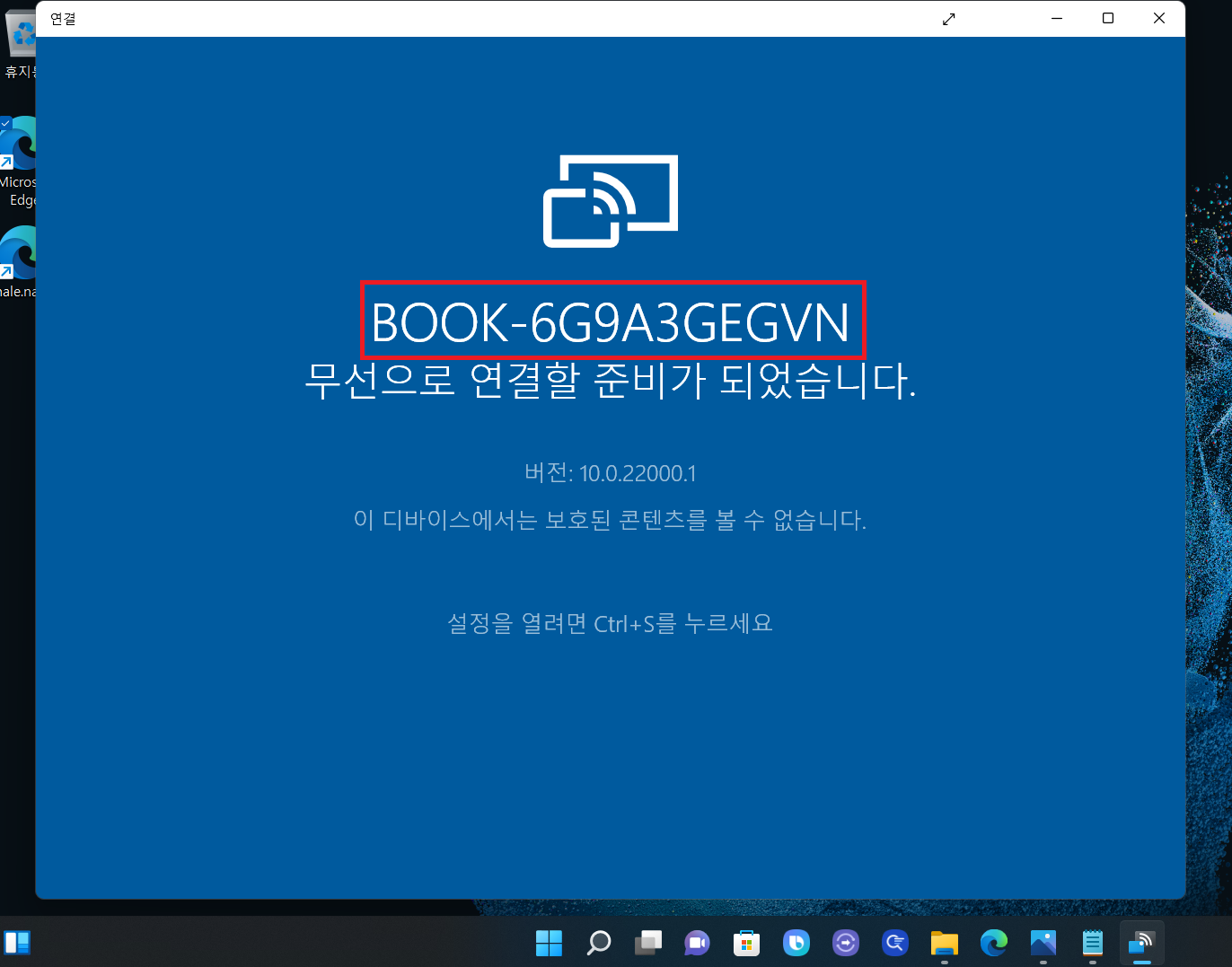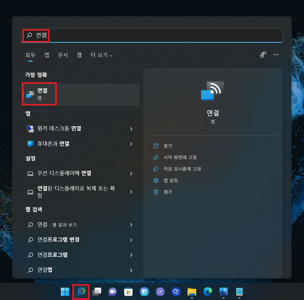 우선 노트북에서 윈도우 검색창을 클릭한 다음 검색창에 연결이라고 검색하면 연결 앱이 뜨고 그걸 실행하면 파란색 창이 뜨면서 무선으로 연결할 준비가 되었습니다 라는 창이 뜹니다. 그럼 제품 이름만 기억하고 있으면 노트북에서 설정은 끝납니다.