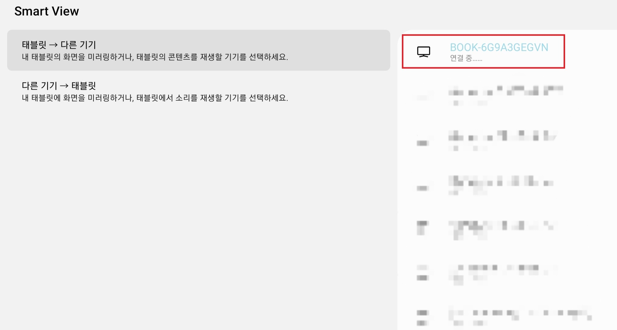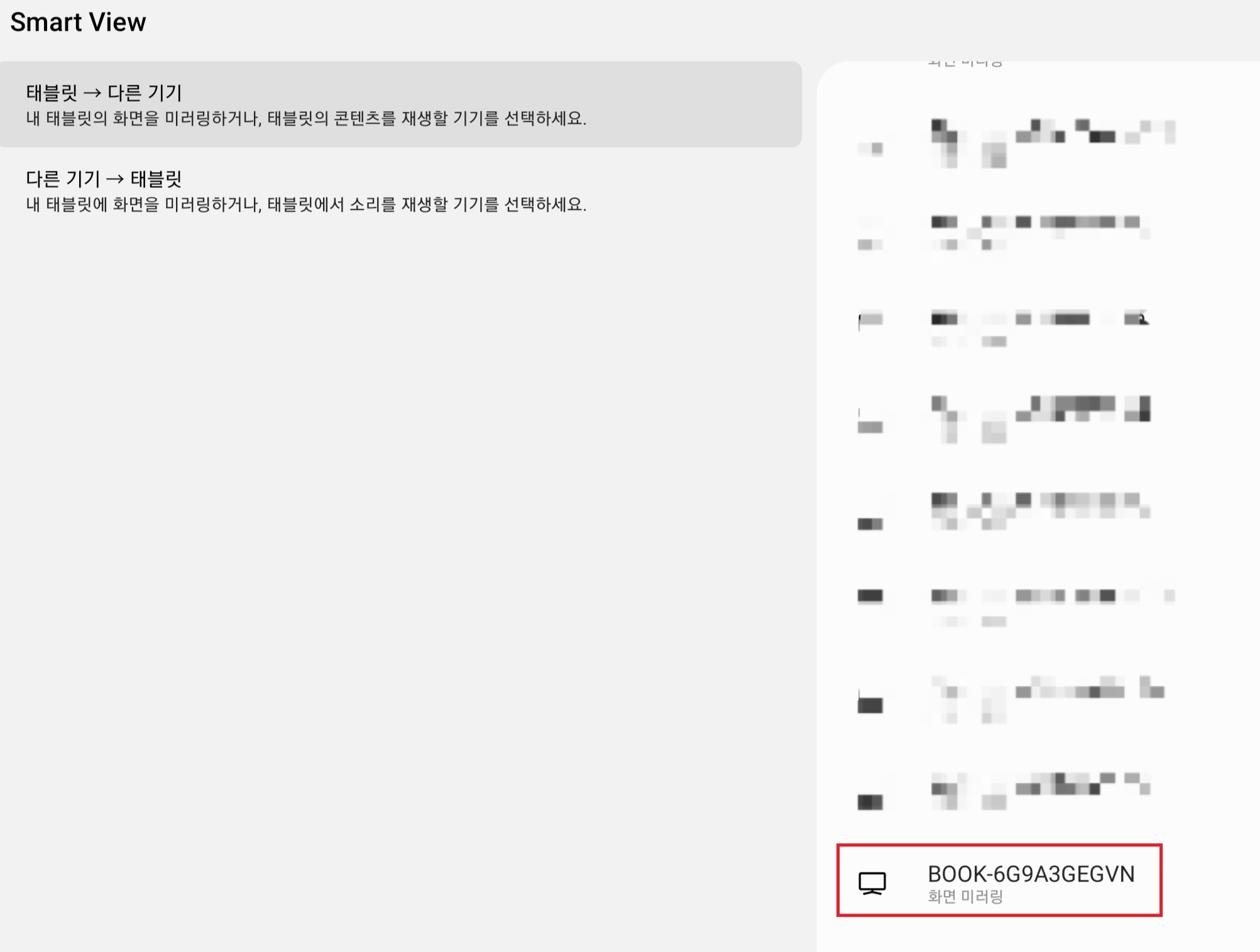 그럼 갤럭시탭 화면을 노트북으로 전송해 노트북에서 갤럭시탭 화면을 볼 수 있게 됩니다. 이 기능은 갤럭시탭 스마트 뷰(Smart View) 기능만 있다면 사용할 수 있는 기능입니다. 그럼 스마트폰 화면도 노트북으로 사용할 수 있는 기능입니다.