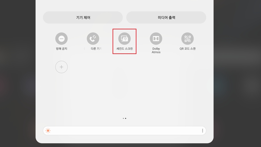 그럼 세컨드 스크린 활성화하는 방법에 대해 알아보도록 하겠습니다. 우선 가지고 있는 갤럭시탭을 최신 버전으로 업데이트해줍니다. 그다음 갤럭시탭 화면을 위에서 아래로 두 번 내려서 퀵패널 활성화하고 세컨드 스크린을 찾아서 클릭해줍니다. 만약 안 보인다면 + 버튼을 눌러서 세컨드 스크린을 찾아 활성화시켜줍니다.