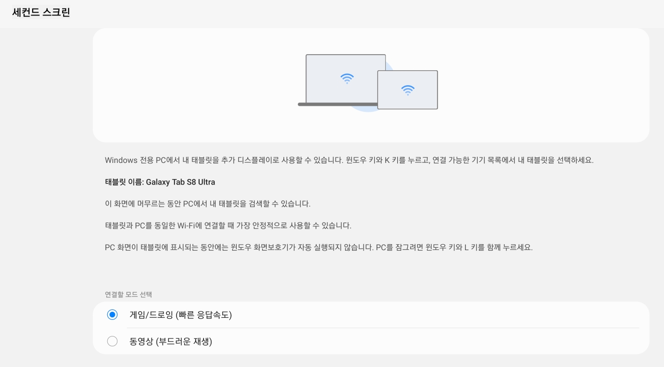 퀵패널에서 세컨드 스크린을 클릭해 활성화를 하면 밑에 있는 이미지처럼 갤럭시탭에 뜨게 되고 갤럭시탭을 동영상 위주로 사용할꺼라면 연결할 모드 선택에서 동영상을 클릭해주고 갤럭시탭으로 노트북이랑 같이 다양한 작업을 할 계획이라면 게임/드로잉을 클릭해주면 갤럭시탭에서의 설정은 끝납니다