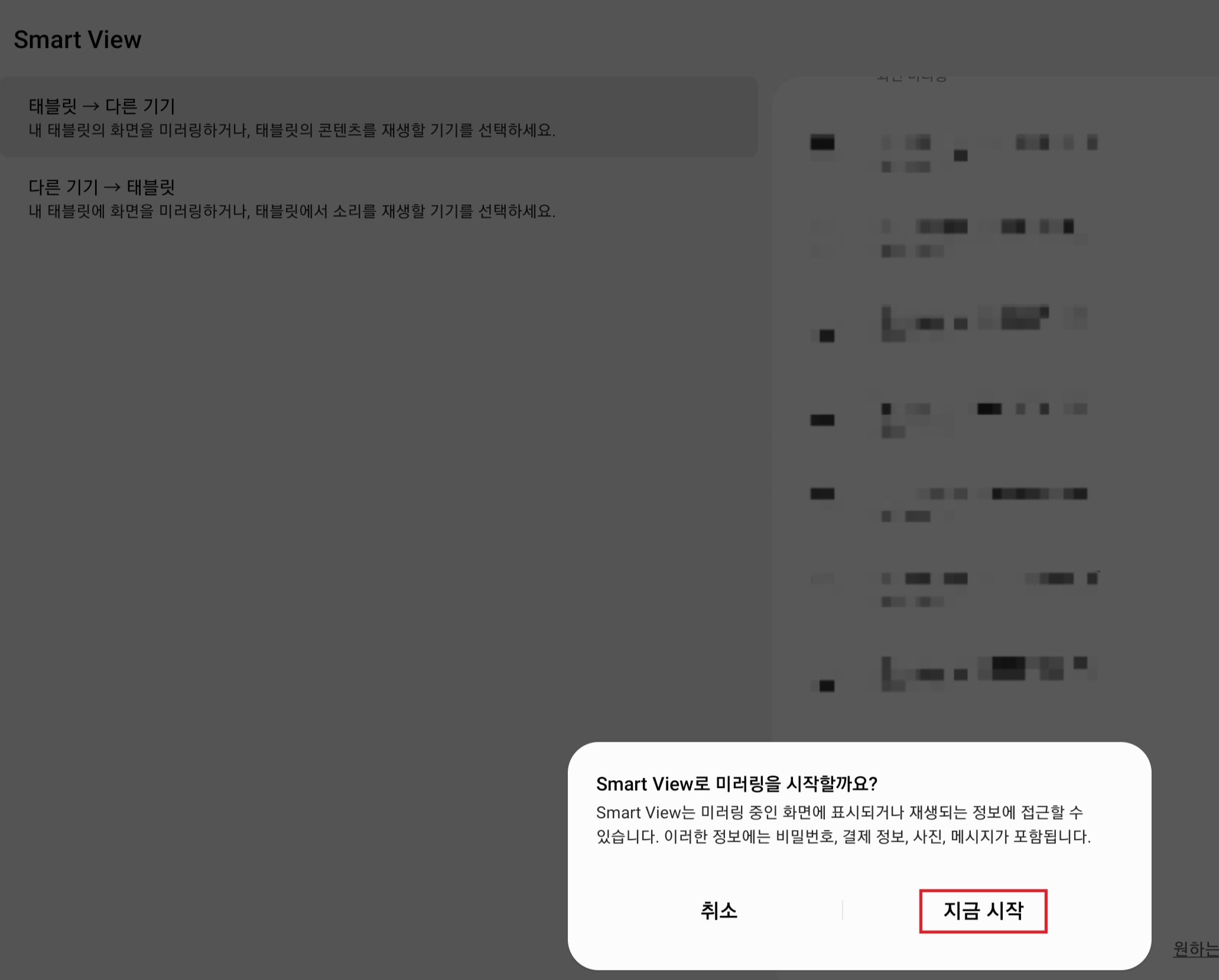 그다음 해당 노트북 이름을 찾아서 클릭하면 스마트 뷰(Smart View)로 미러링을 시작할까요?라고 뜹니다. 그럼 지금 시작을 클릭합니다.