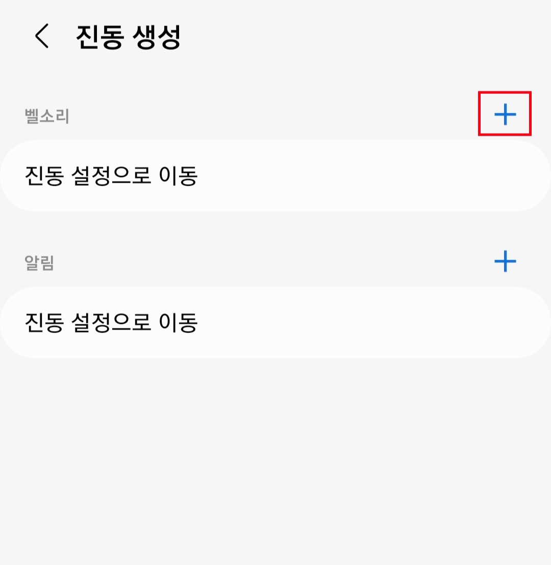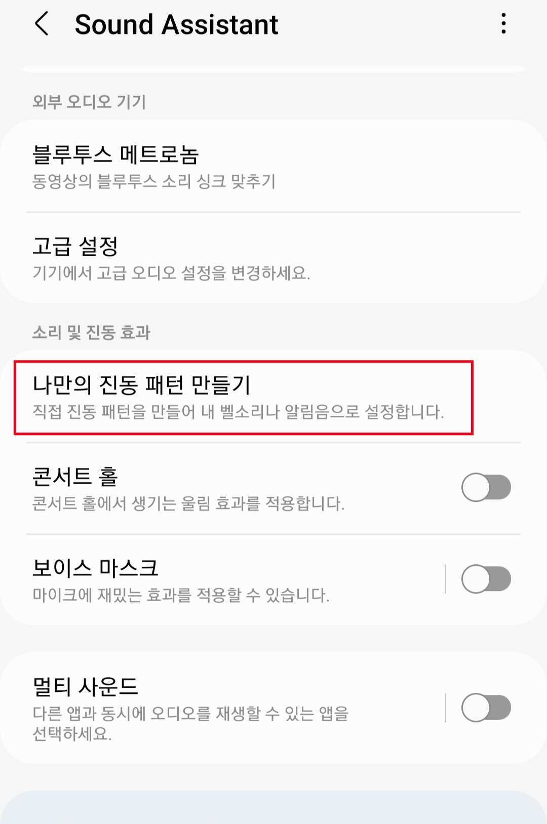 ▼Sound Assistant 앱 실행해 소리 및 진동 효과란에서 "나만의 진동 패턴 만들기"를 클릭 후 벨소리 옆 + 버튼을 클릭해줍니다.