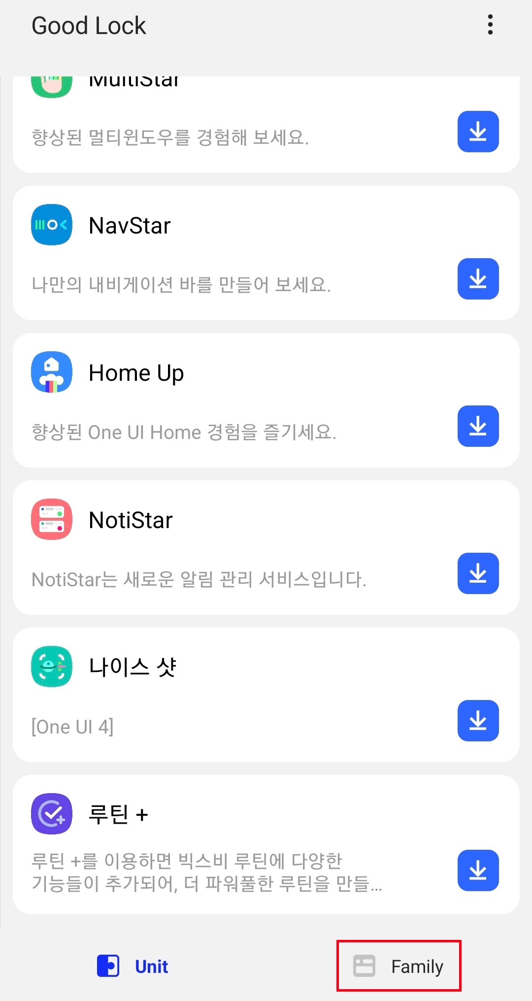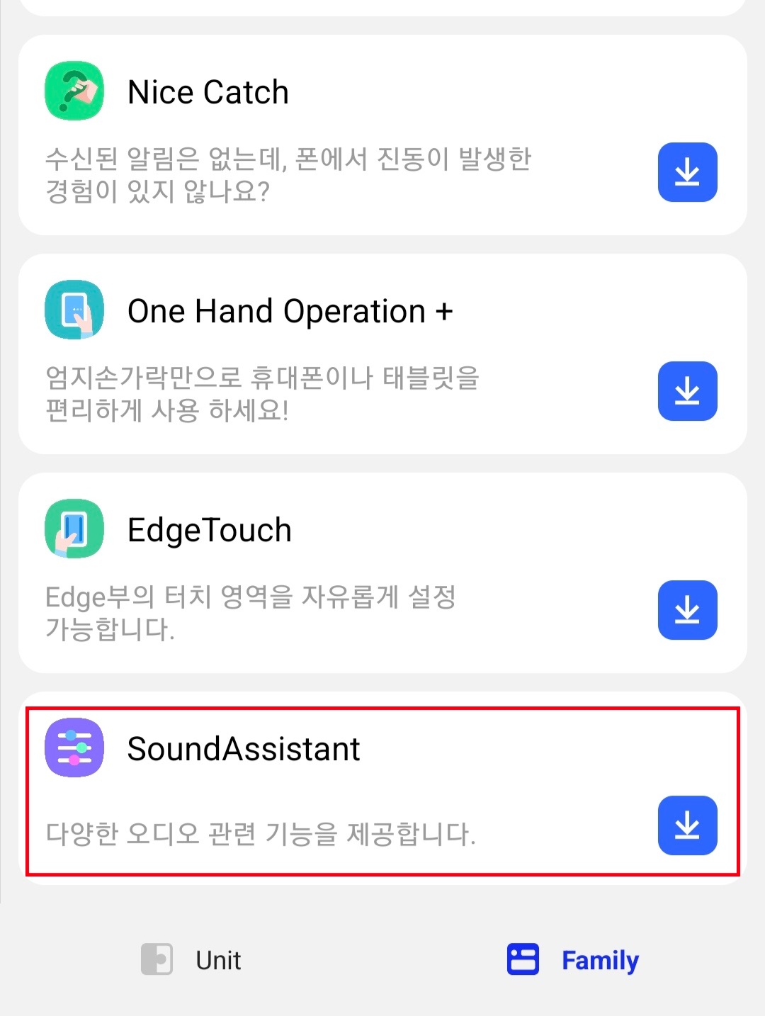 ▼Good Lock 앱을 실행했다면 하단에 Unit에서 Family로 바꿔주시고 Sound Assistant를 찾아 클릭해 Sound Assistant 앱을 설치 후 실행해줍니다.
