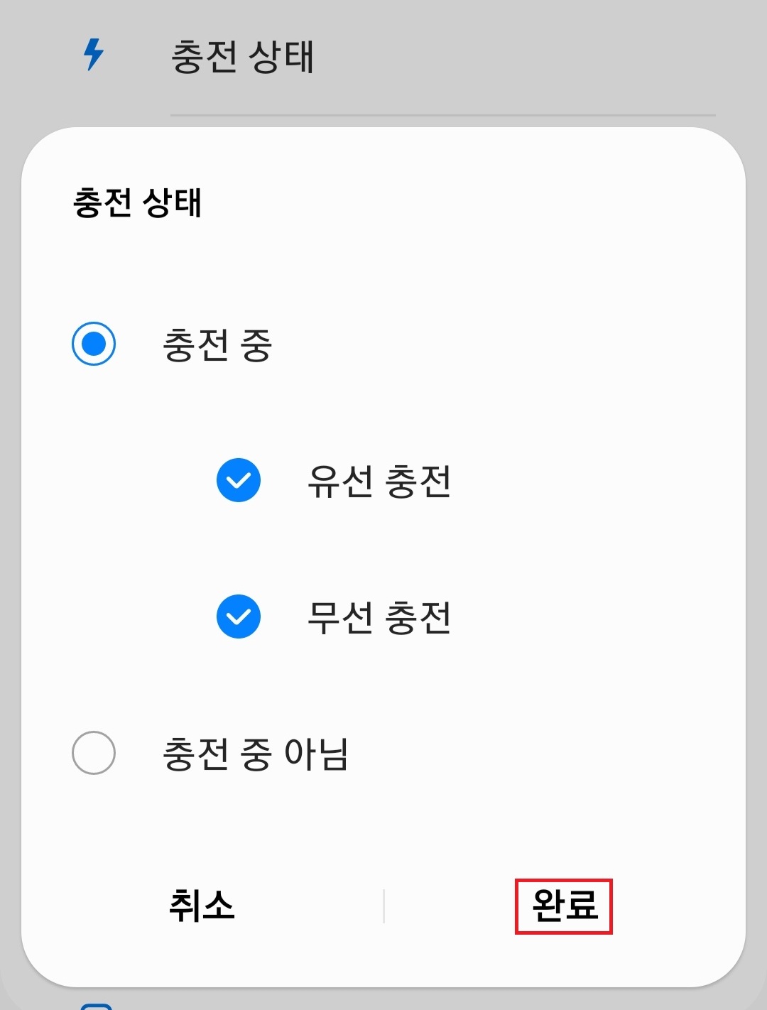 그다음 "충전 상태" 찾아 클릭을 한 다음 유선 충전, 무선 충전 모두 체크 후 "완료"를 눌러줍니다.