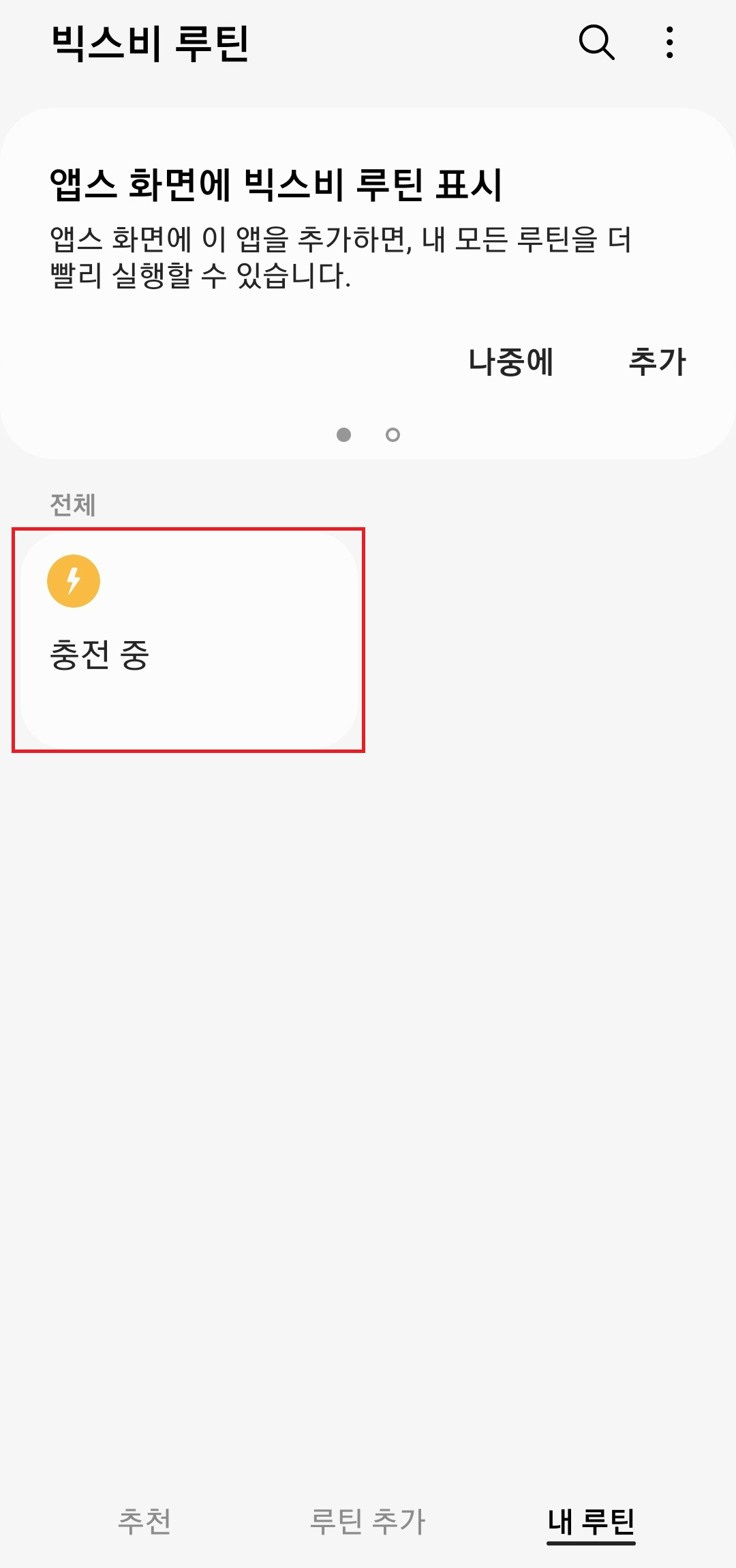 그다음 "빅스비 루틴" 추가 기능을 찾은 다음 빅스비 루틴 기능을 꾹 눌러 이동시킨 후 "확인"을 클릭해줍니다. 그리고 빅스비 루틴기능을 3초 동안 눌러서 실행시킨 다음 빅스비 루틴 "켜기"를 눌러줍니다.