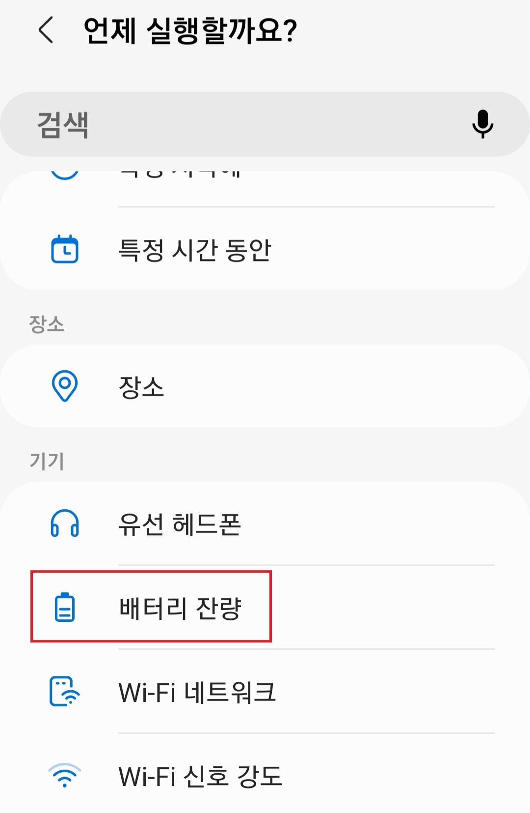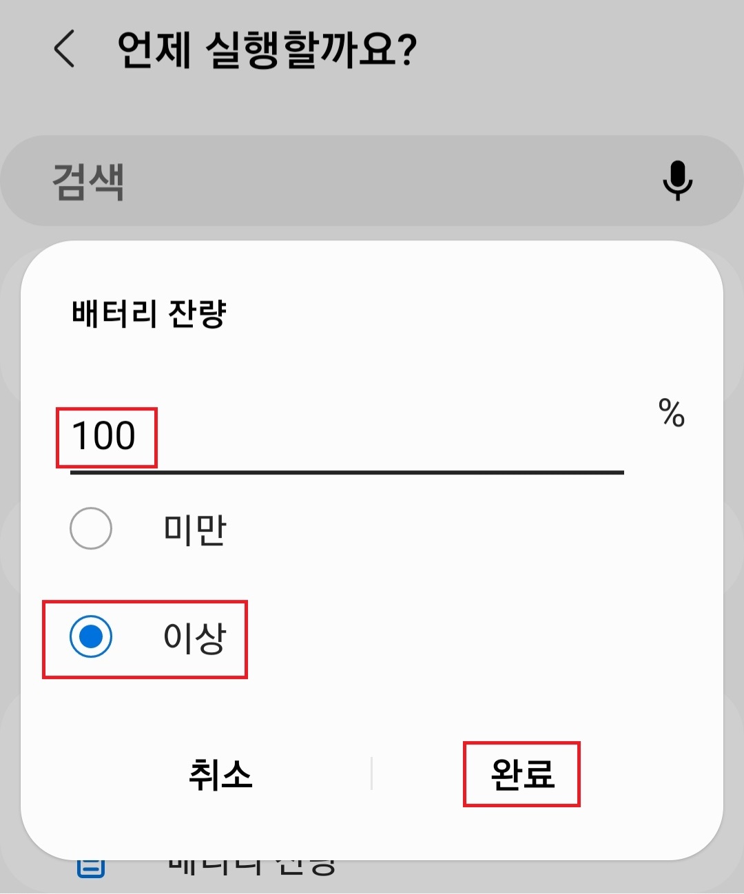 추가로 "배터리 잔량" 찾아 클릭하면 배터리 잔량 퍼센트를 설정할 수 있습니다. 만약 100% 완충시 알람을 울리게 하고 싶다면 배터리 잔량 "100%", "이상" 체크 후 완료를 클릭해주면 되고 만약 나는 100% 충전 시 말고 95% 혹은 85% 충전될 시 알람이 울리게 하고 싶다면 원하는 퍼센트를 등록 후 "완료"를 클릭해주면 됩니다.