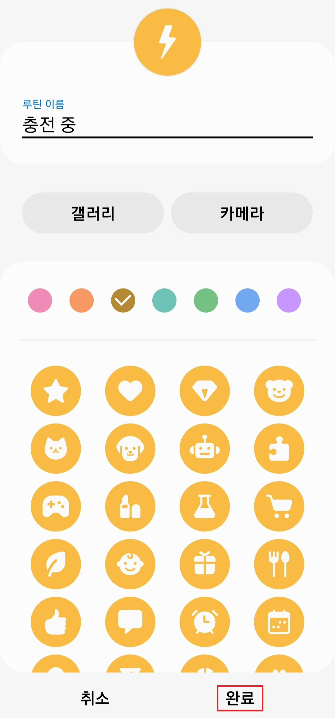 그다음 현재 만든 루틴 이름, 원하는 색상 그리고 이모티콘을 선택 후 "완료"를 눌러주면 내가 만든 루틴이 생성되고 그럼 배터리 100% 충전시 스마트폰에서 알람이 울리게 됩니다.