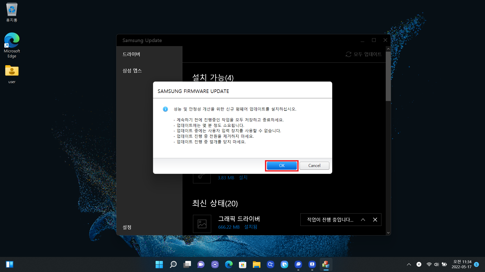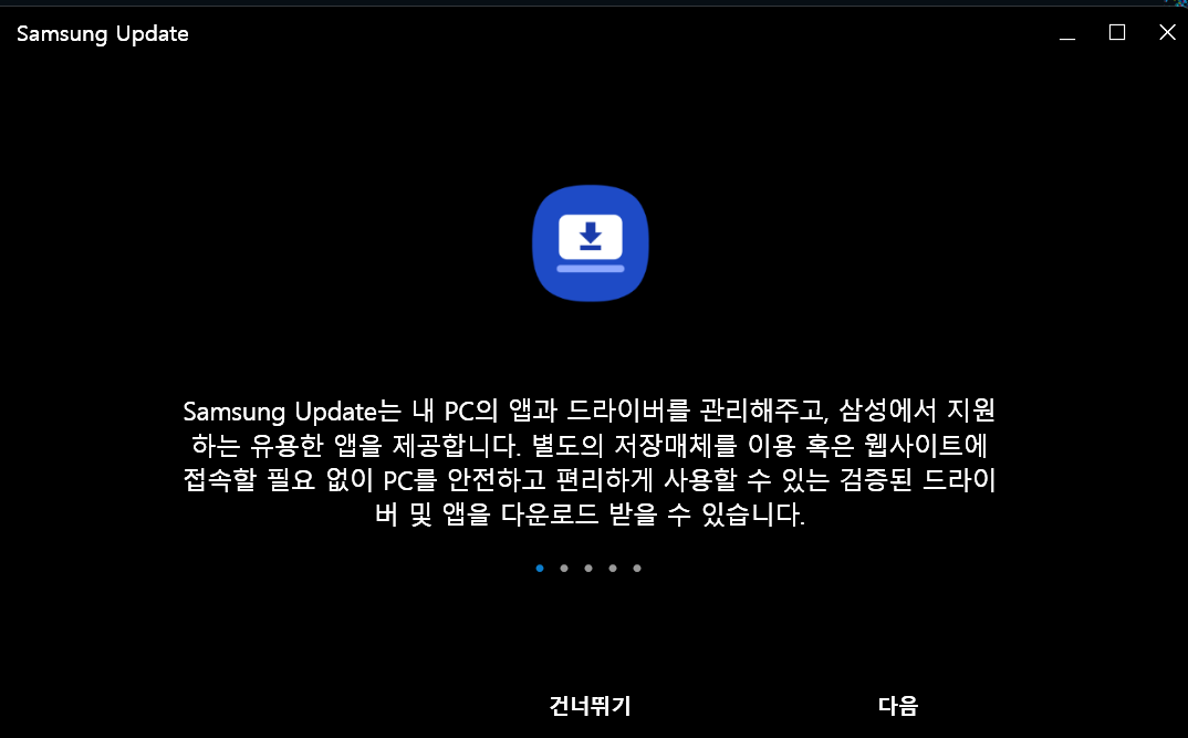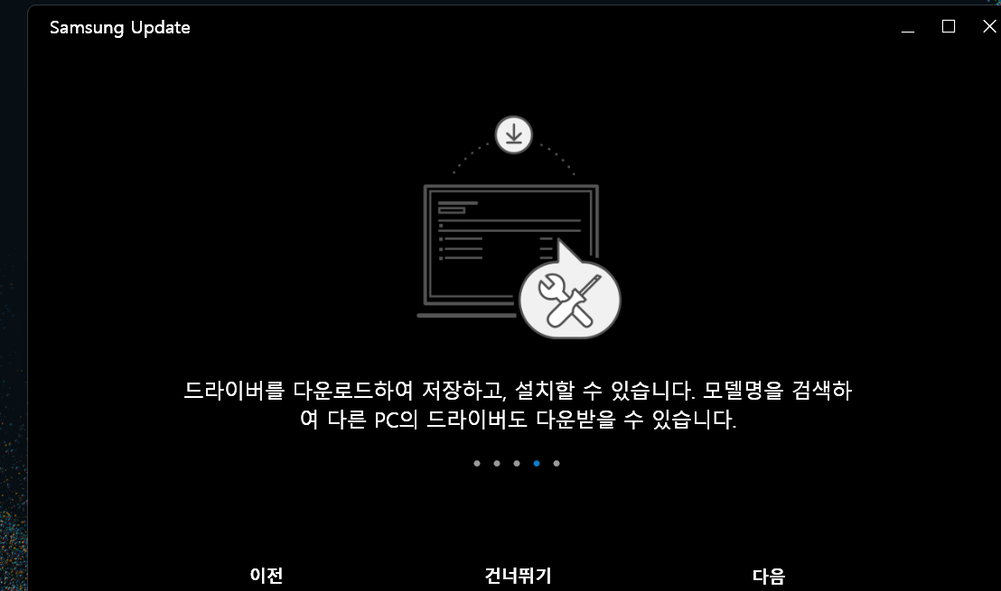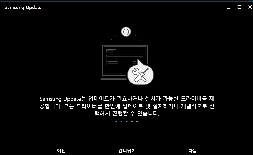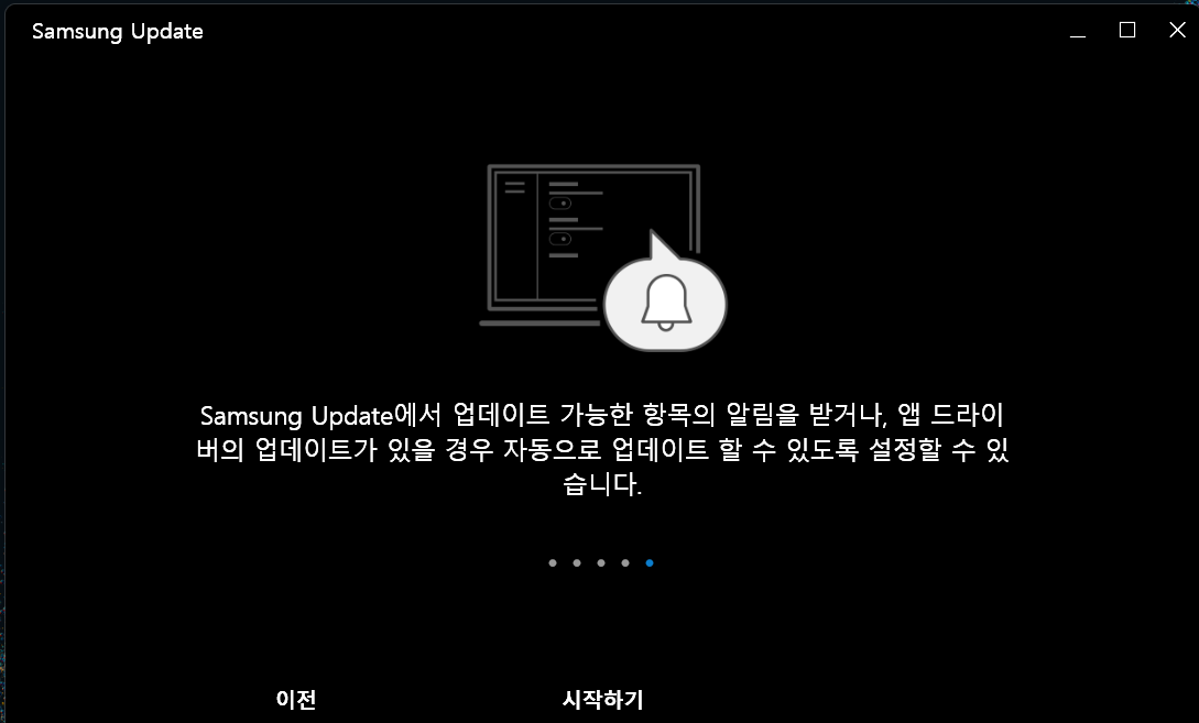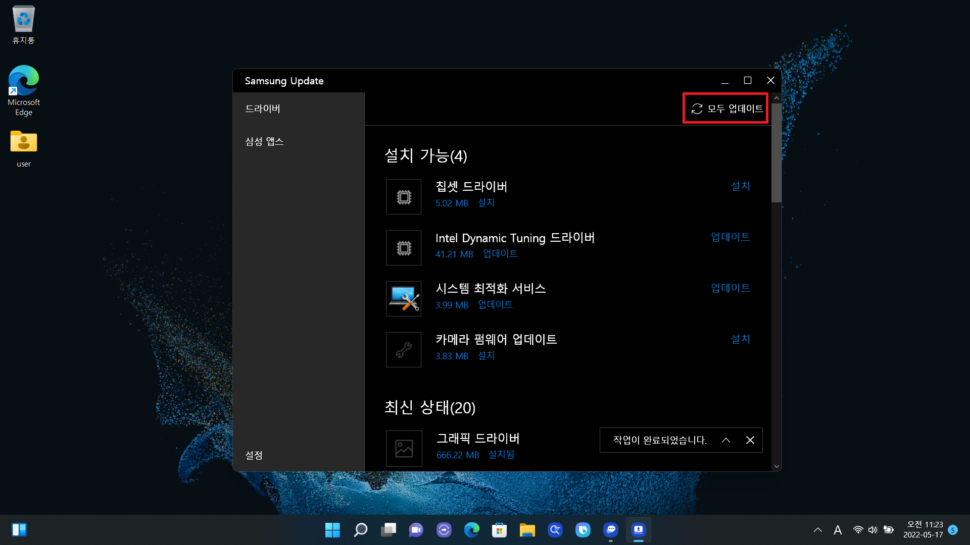 재부팅되었다면 동일하게 접근해서 업데이트하는 방법이 있고 아니면 윈도우 검색창에 "Samsung Update"라고 검색 후 앱을 실행해도 됩니다. 그다음 "모두 업데이트"를 클릭하면 자동으로 업데이트가 진행되고 마지막에 또 재부팅을 하라고 하는데 OK 눌러주면 됩니다.