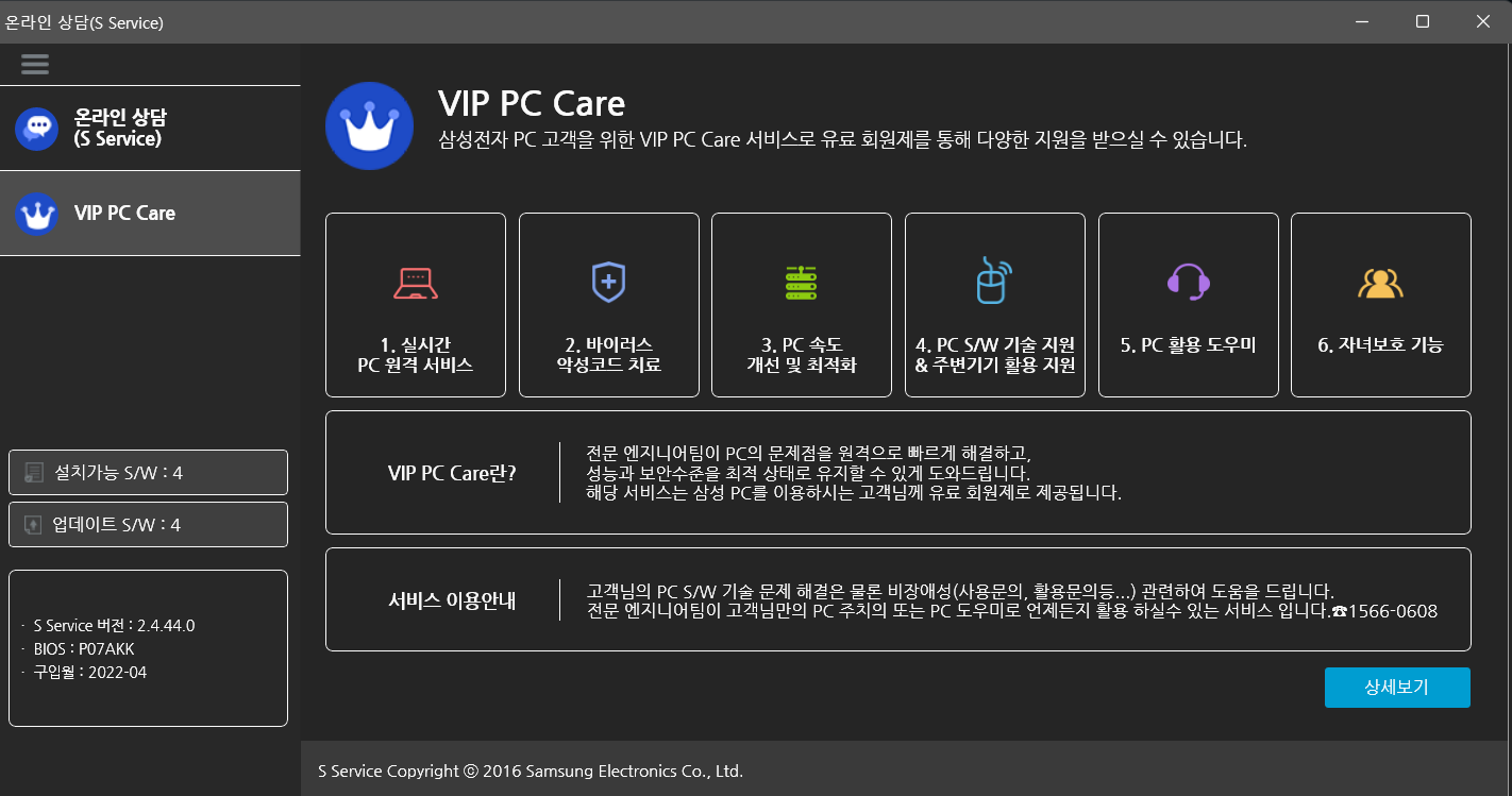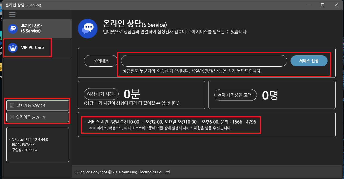 온리인 상당(S Service) 앱을 실행하게 되면 이와 같은 창이 뜹니다. 그럼 문의 내용에 받고 싶은 서비스 내용을 작성 후에 서비스 신청을 클릭하면 전문상담사랑 연결되면서 원격제어를 통해 무료로 노트북 서비스를 받아 볼 수 있고 VIP PC Care라고 해서 유료 버전도 있습니다. 그리고 온라인 상담(S Service) 앱에 좋은 점은 현재 사용 중인 노트북 S/W 업데이트해야 하는 개수도 알려줘 쉽게 노트북 업데이트도 할 수 있습니다.