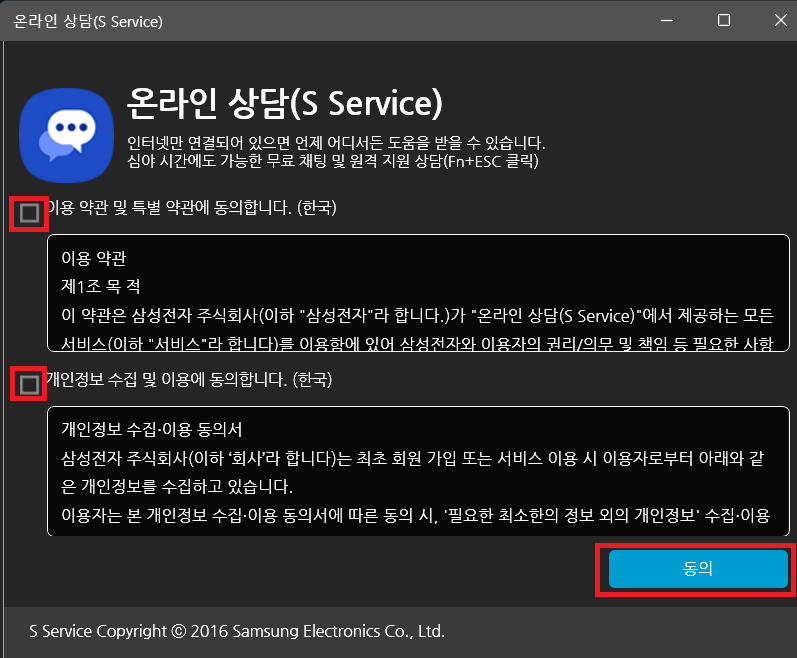 실행이 되면 간단한 이용 약관 및 특별 약관 그리고 개인정보 수집 및 이용 동의에 체크를 한 다음 동의를 눌러주면 됩니다.