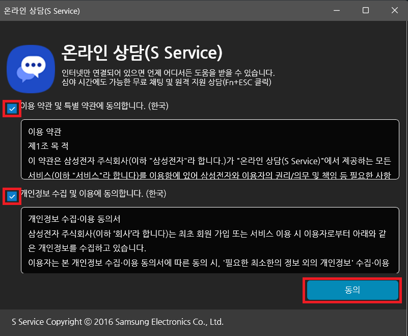 실행이 되면 간단한 이용 약관 및 특별 약관 그리고 개인정보 수집 및 이용 동의에 체크를 한 다음 동의를 눌러주면 됩니다.