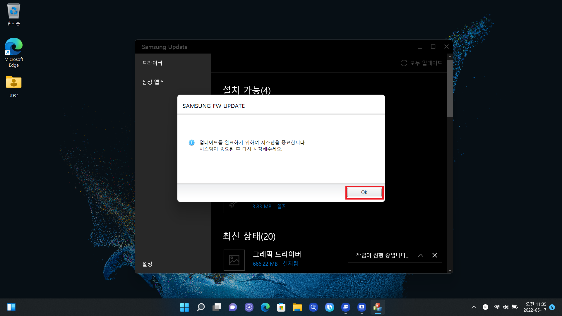 재부팅되었다면 동일하게 접근해서 업데이트하는 방법이 있고 아니면 윈도우 검색창에 "Samsung Update"라고 검색 후 앱을 실행해도 됩니다. 그다음 "모두 업데이트"를 클릭하면 자동으로 업데이트가 진행되고 마지막에 또 재부팅을 하라고 하는데 OK 눌러주면 됩니다.