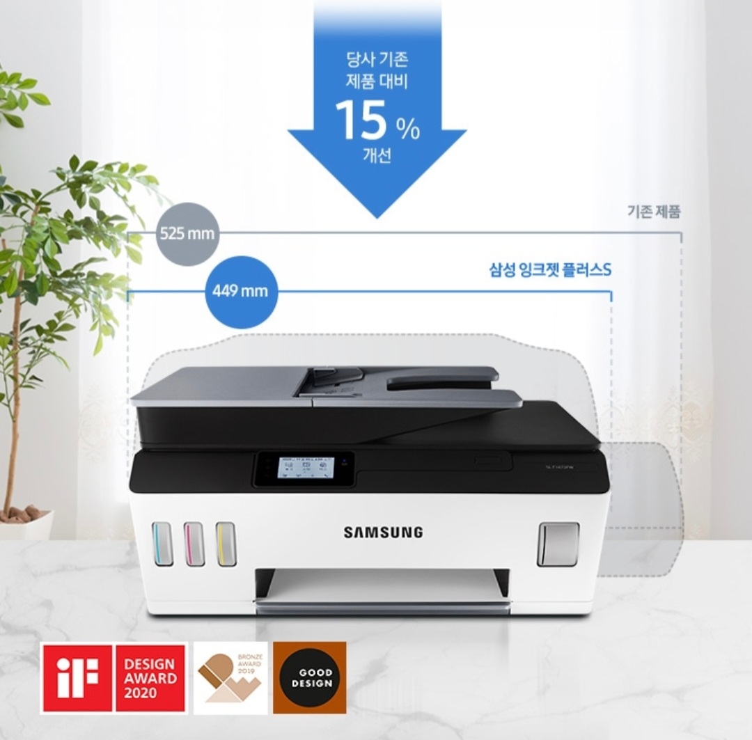 기준 삼성 무한 잉크젯 플러스 대비 잉크젯 플러스S는 잉크를 붓는 통을 일체형 디자인으로 만들어 15%(78mm)나 개선된 사이즈로 사이즈가 더욱 슬림해져 자녀 공부방, 서재 혹은 거실에 놓아도 나쁘지 않은 디자인로 출시를 했습니다.
