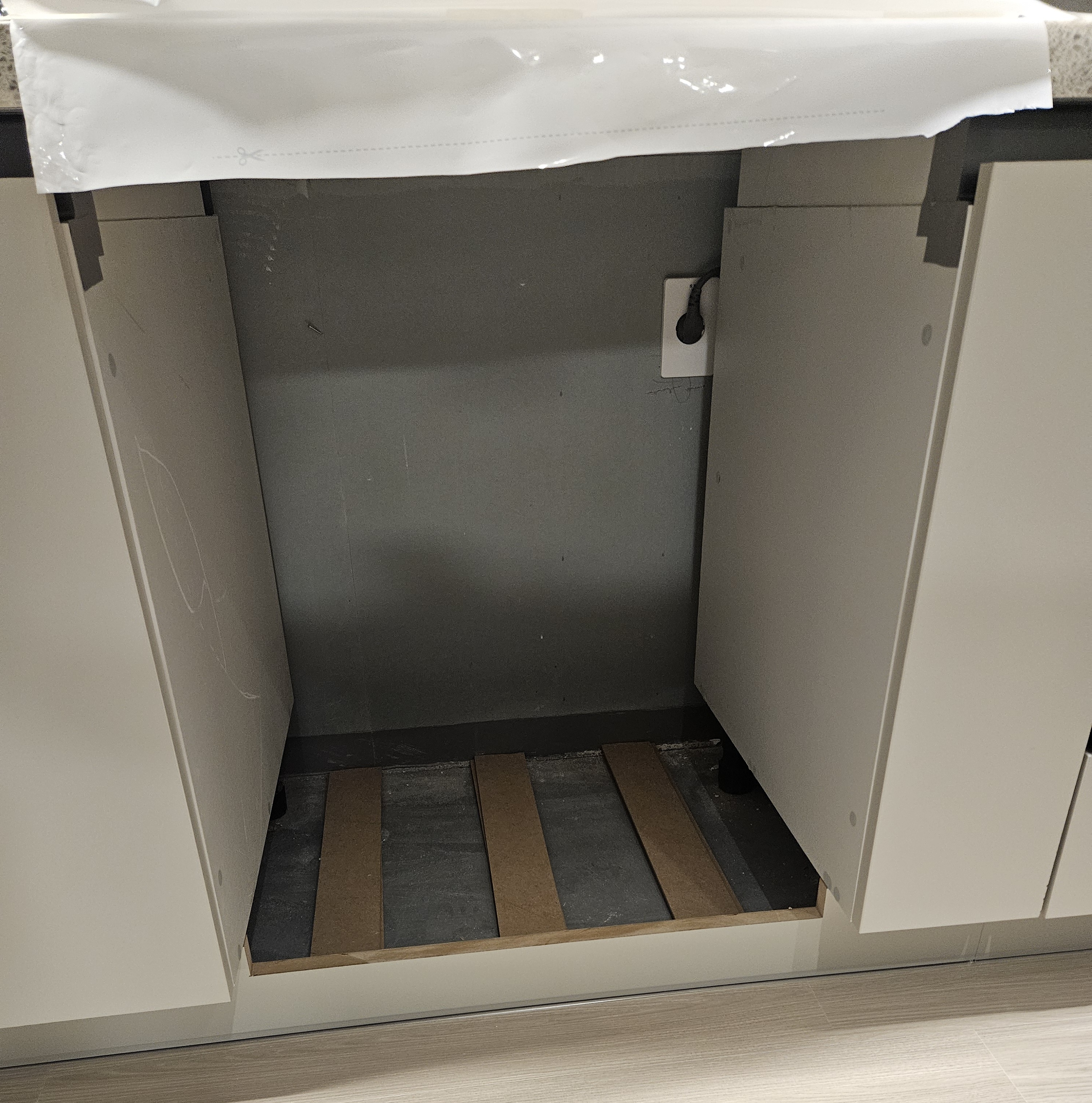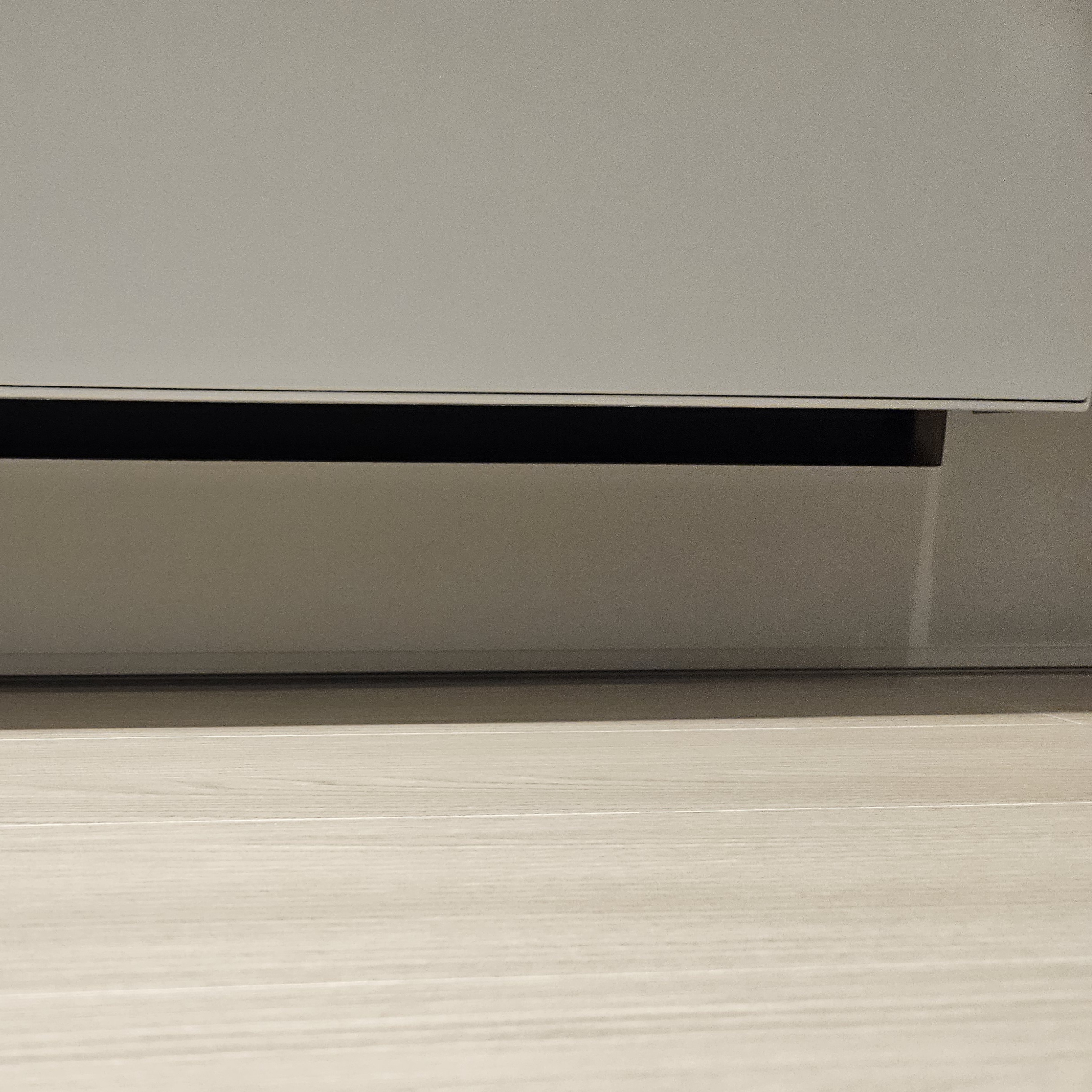 하지만 바로 식기세척기 바로 아래 하부장의 걸레받침대 부분이 조금 절단되어 있는 거 있죠. 설마 잘못 설치된 게 아닌가 싶었지만 식기세척기 문이 열 때 간섭이 안 생기게 조금은 절단한다고 하더라고요.