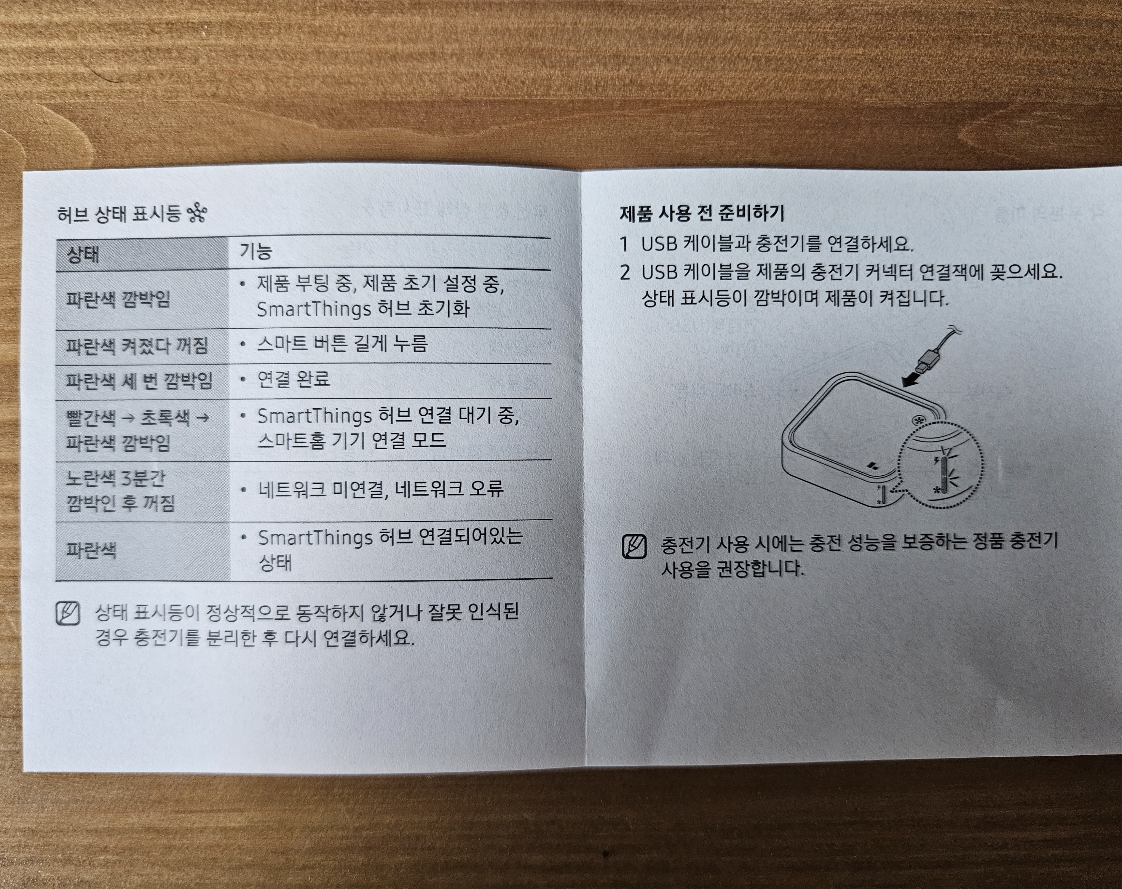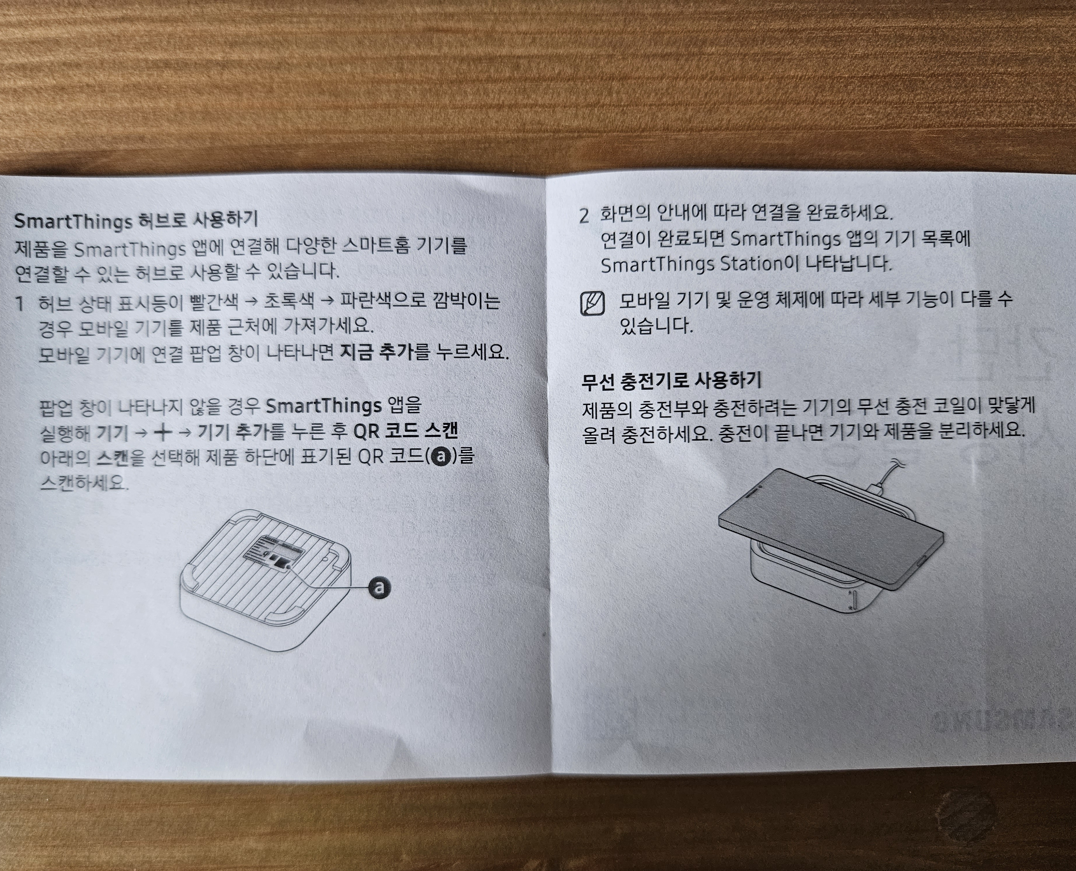 허브 상태 표시등 설명이 써져 있었고 스마트싱스 허브로 사용하는 방법에 대한 것도 써져 있었는데요. 허브 기능은 24년 8월에 청약에 당첨되어 이사를 가게 되는데 그때 유용하게 사용해 볼 계획입니다. 그리고 마지막으로 무선 충전기로도 사용할 수 있다는 설명이 써져 있었습니다.