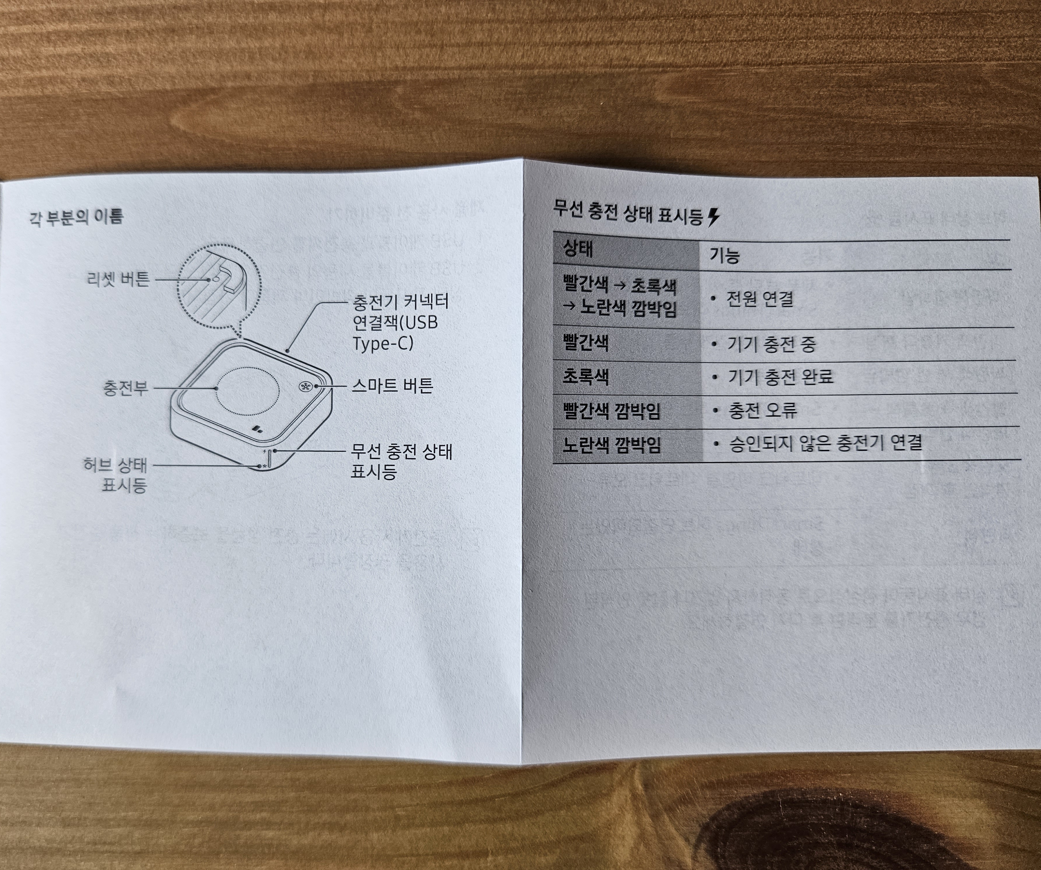 간단 설명서를 보니 스마트싱스 스테이션은 이상 있을 시 1년 동안 보증을 해주고 케이블은 6개월 동안 보증을 해준다고 명시되어 있었고 스마트싱스 스테이션 각 부분의 이름과 무선 충전 상태 표시등에 대한 설명과