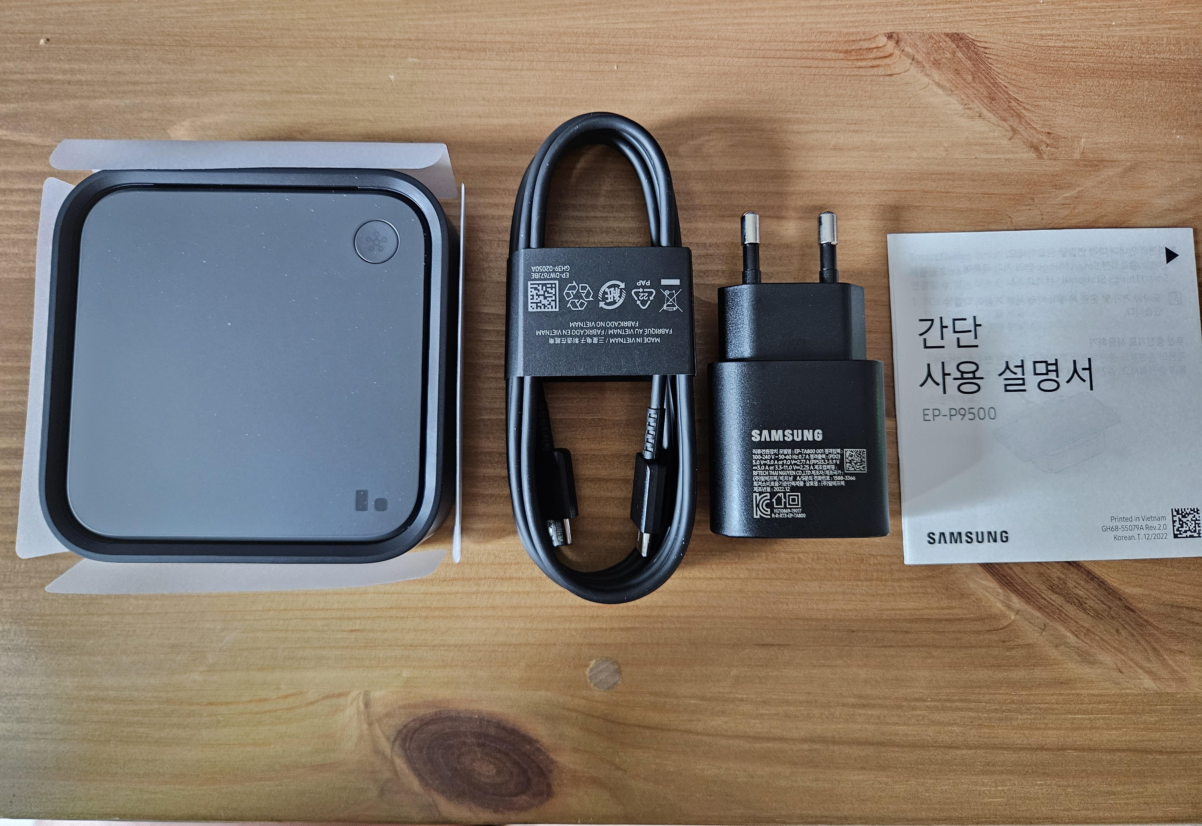 스마트싱스 스테이션 박스를 개봉하니 스마트싱스 스테이션 본체, C타입 초고속 충전기, C to C 케이블, 간단 사용 설명서가 들어있었습니다.