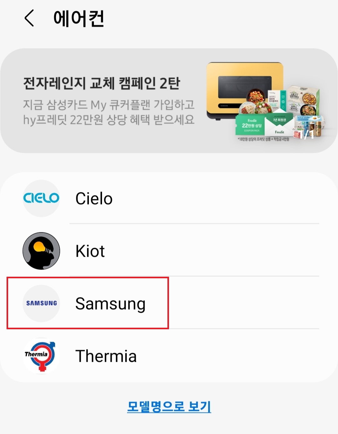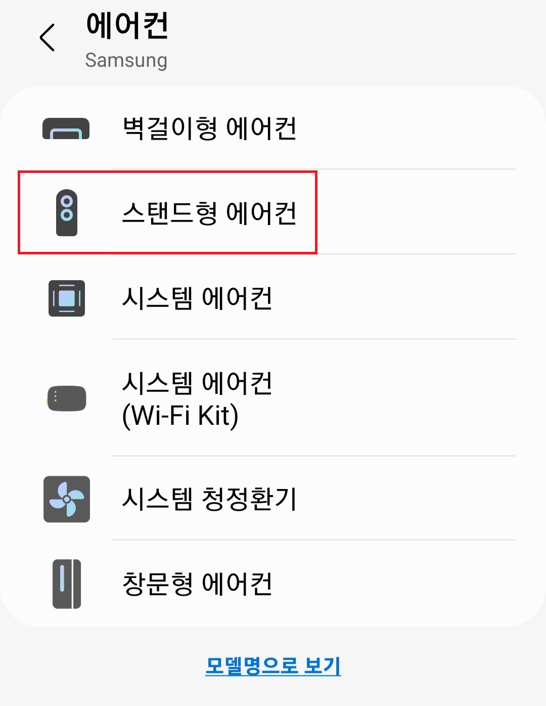 그다음 페이지에서 삼성 에어컨을 사용 중이니 "Samsung"를 클릭하고 해당 에어컨 유형을 선택해줍니다. 저는 스탠드형 에어컨을 사용하고 있어 스탠드형 에어컨을 클릭했습니다.