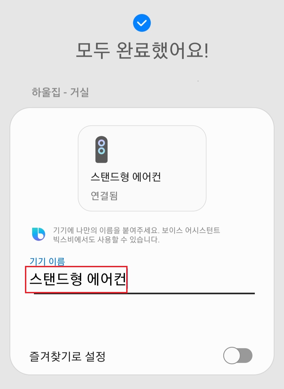 스마트폰이랑 에어컨이 연동이 되면 기기 이름을 설정해주고 완료하면 연동은 끝납니다.