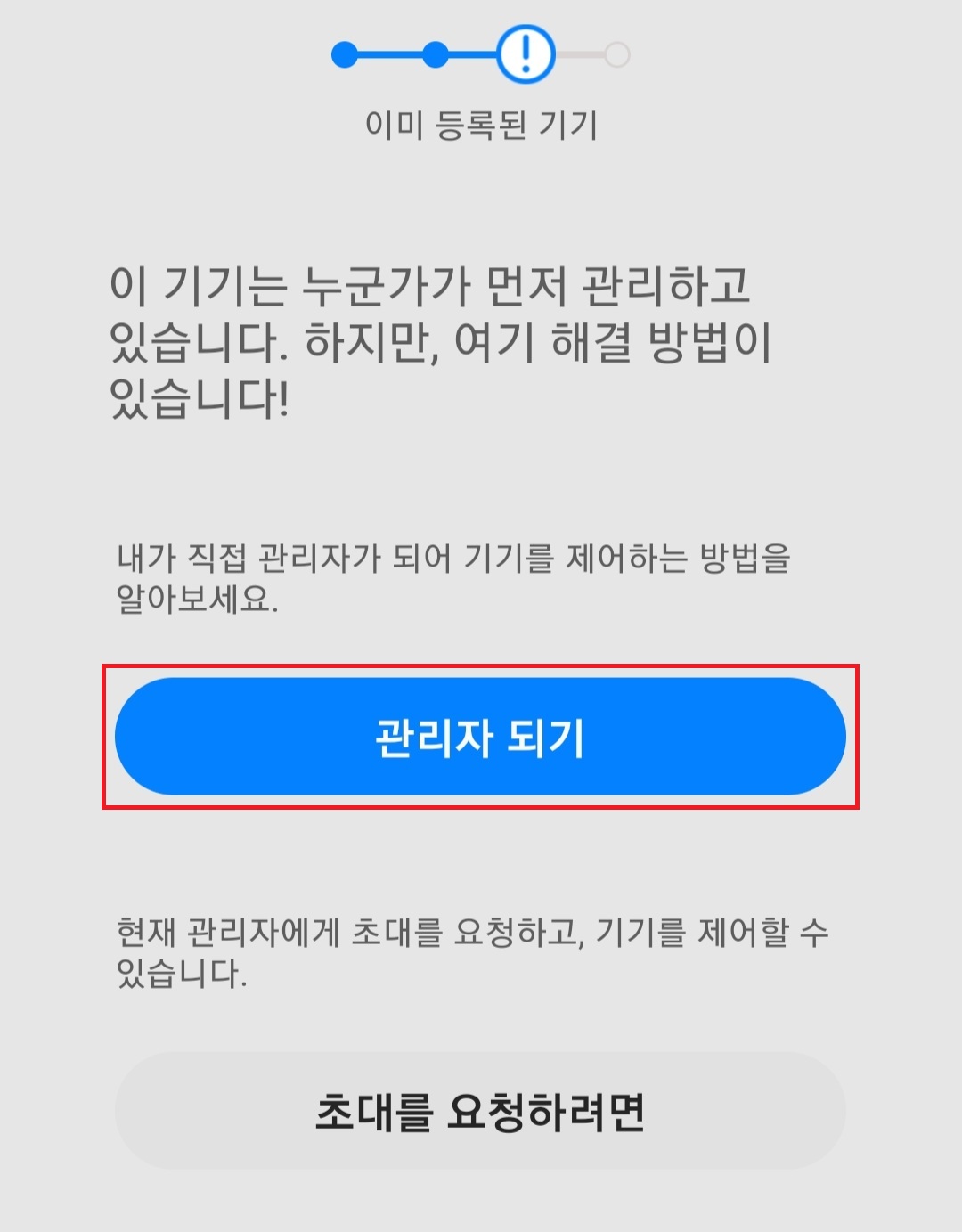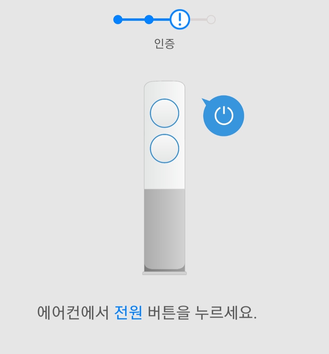 와이프보단 제가 가전제품에 관심이 많다 보니 "관리자 되기" 선택하여 진행하였고 그다음으로 에어컨 본체에 있는 전원 버튼을 누르라는 페이지가 뜹니다. 그럼 리모컨으로 전원을 끄지 말고 꼭 본체 제품에 전원 버튼을 눌러줍니다.