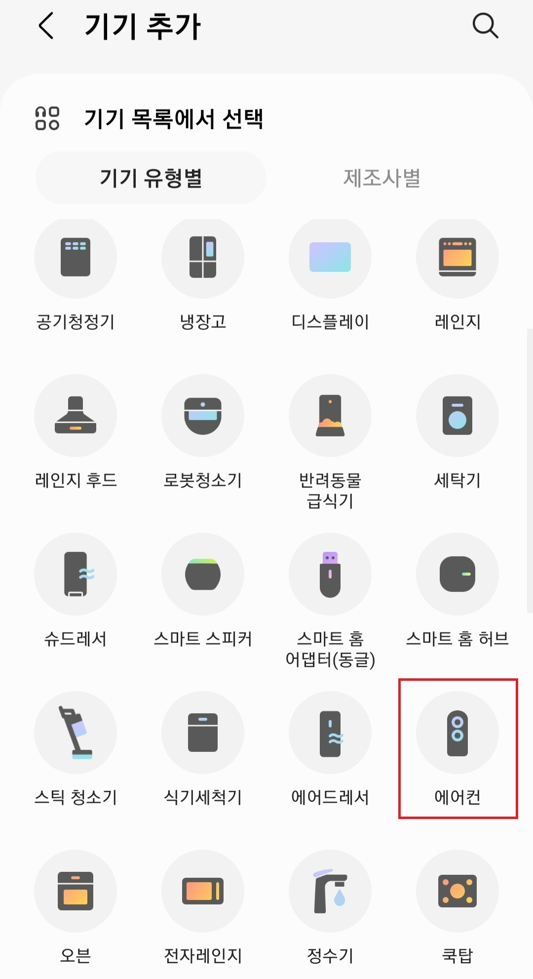 그럼 다양한 삼성가전제품들을 스마트 싱스에 등록해서 사용할 수 있습니다. 그중 "에어컨 기기"를 찾아 스마트폰이랑 연동해보겠습니다.