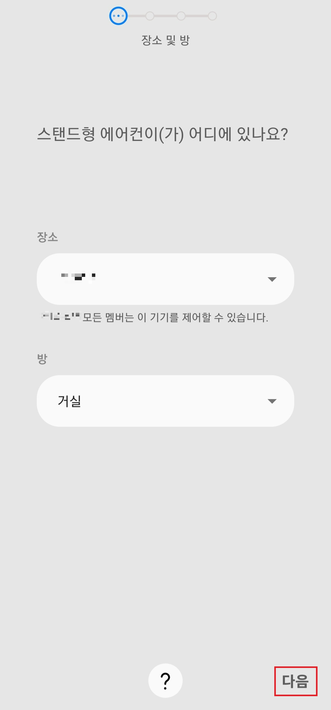 현재 에어컨 설치되어있는 장소와 방을 선택을 하고 "다음"을 클릭합니다. 그다음 밑에 있는 리모컨 이미지 중 왼쪽 리모컨을 사용 중이라면 무풍 버튼을 오른쪽 리모컨을 사용 중이라면 예약 버튼을 약 5초 이상 길게 눌러줍니다.
