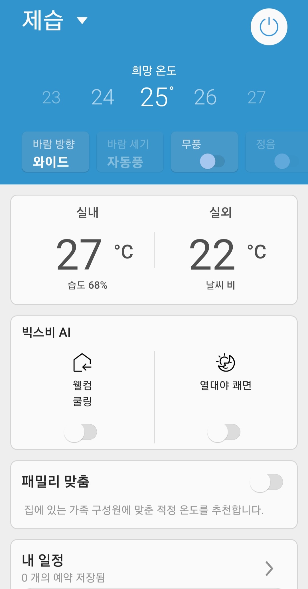그럼 스마트 싱스 어플을 실행하면 에어컨을 컨트롤할 수 있게 됩니다. 예를 들어 열대야가 찾아와 밤에 잠을 자는데 더워서 에어컨을 틀고 싶을 때 굳이 리모컨을 찾으러 거실에 나오지 않고도 스마트폰으로 제어할 수가 있고 반대로 외출을 했는데 깜빡하고 에어컨을 못 끄고 나왔을 때 스마트폰으로 제어가 가능합니다. 그 외 리모컨에 있는 웬만한 기능들은 스마트폰으로 제어가 가능하고 추가로 에어컨 필터 청소 시기가 되면 알람을 해주기 때문에 더욱더 사용 중인 에어컨을 청결하게 사용할 수 있습니다.