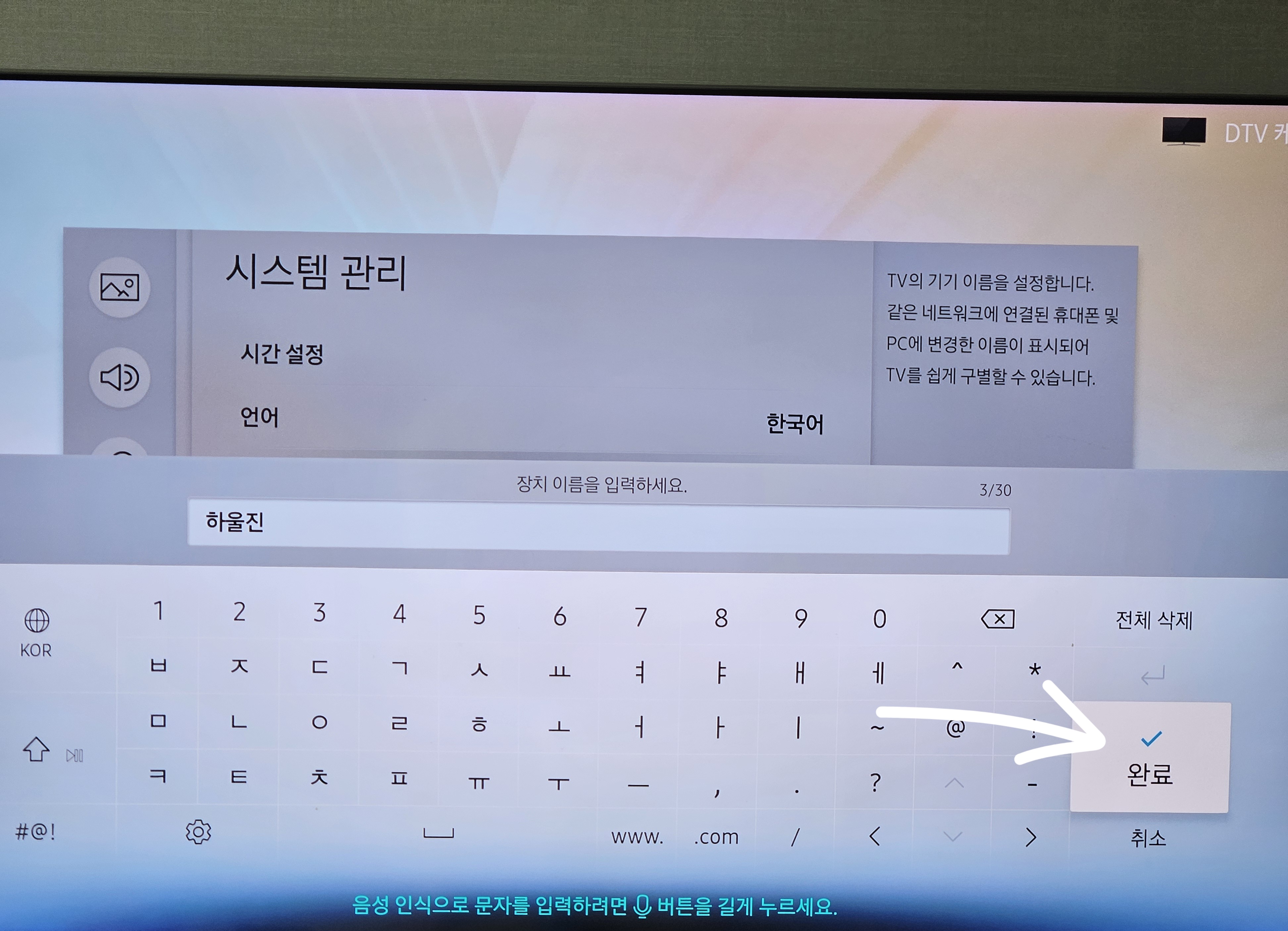 ▼그럼 현재 등록되어 있는 삼성 TV 이름을 [전체 삭제]를 해준 다음 원하는 닉네임을 설정 후 [완료]를 클릭해 주면 TV 이름이 변경됩니다.