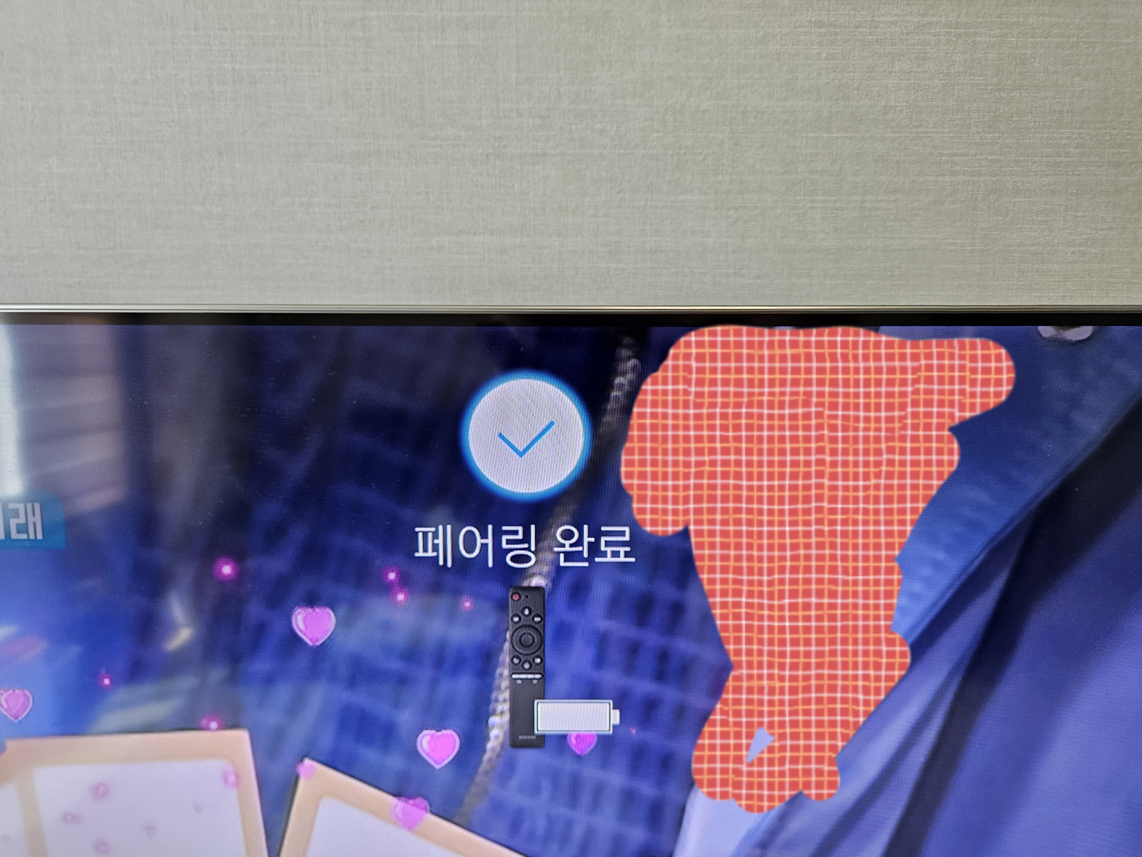 ▼그럼 자동으로 TV화면에 [삼성 스마트 리모컨에 연결 중...]이라는 문구가 뜨고 약 5~ 7초 정도가 지나면 [페어링 완료]라고 뜰 겁니다. 그다음 리모컨 버튼이 잘 눌리는지 확인해 보세요.