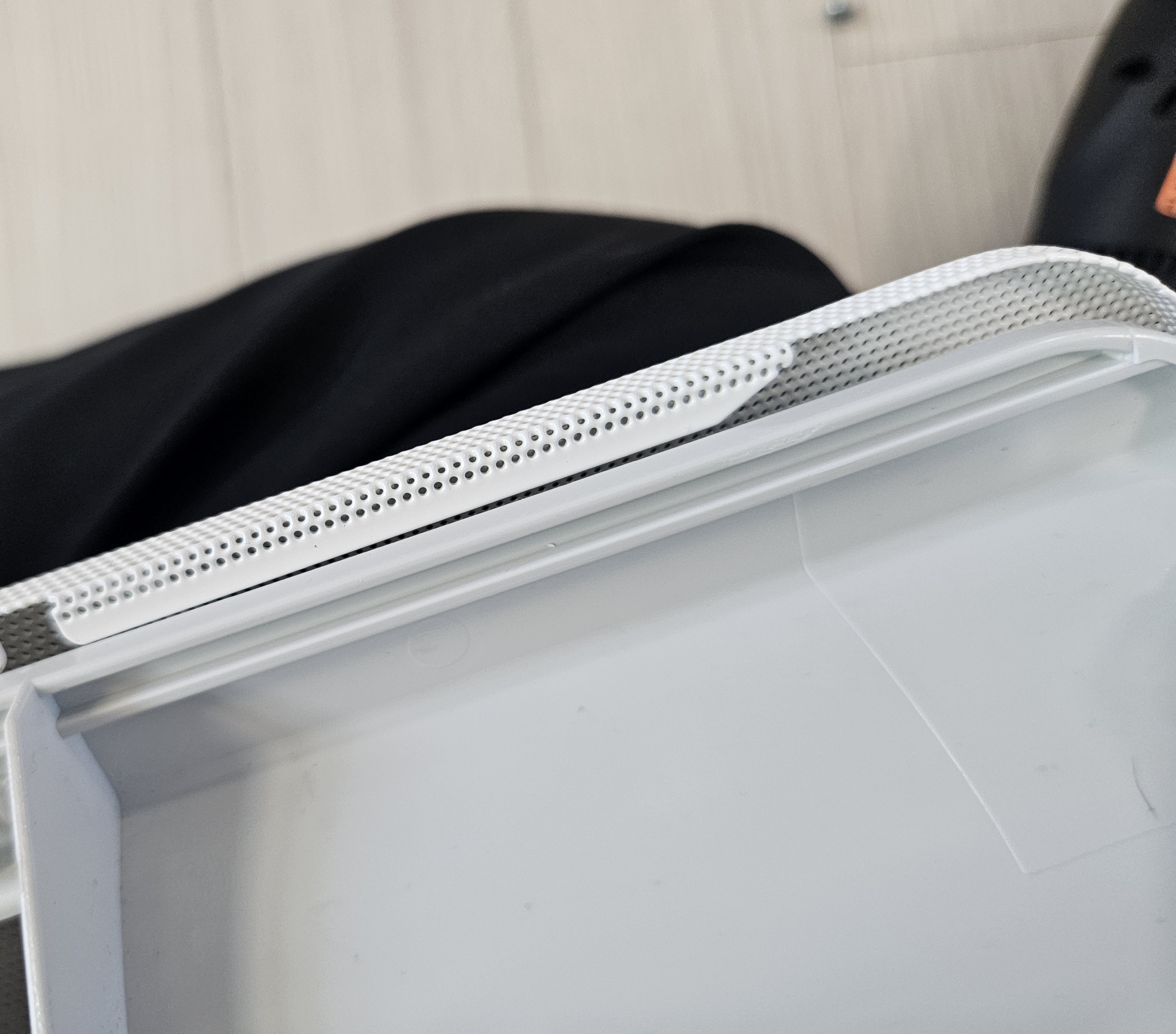 ▼반대쪽 부분도 동일하게 뾰족한 걸로 벌려주고 밀어주면 패널이 분리가 됩니다. 상단, 하단을 동일방식으로 진행해 주세요. 그럼 슬림무풍에어컨 패널만 쏙 분리될 겁니다.