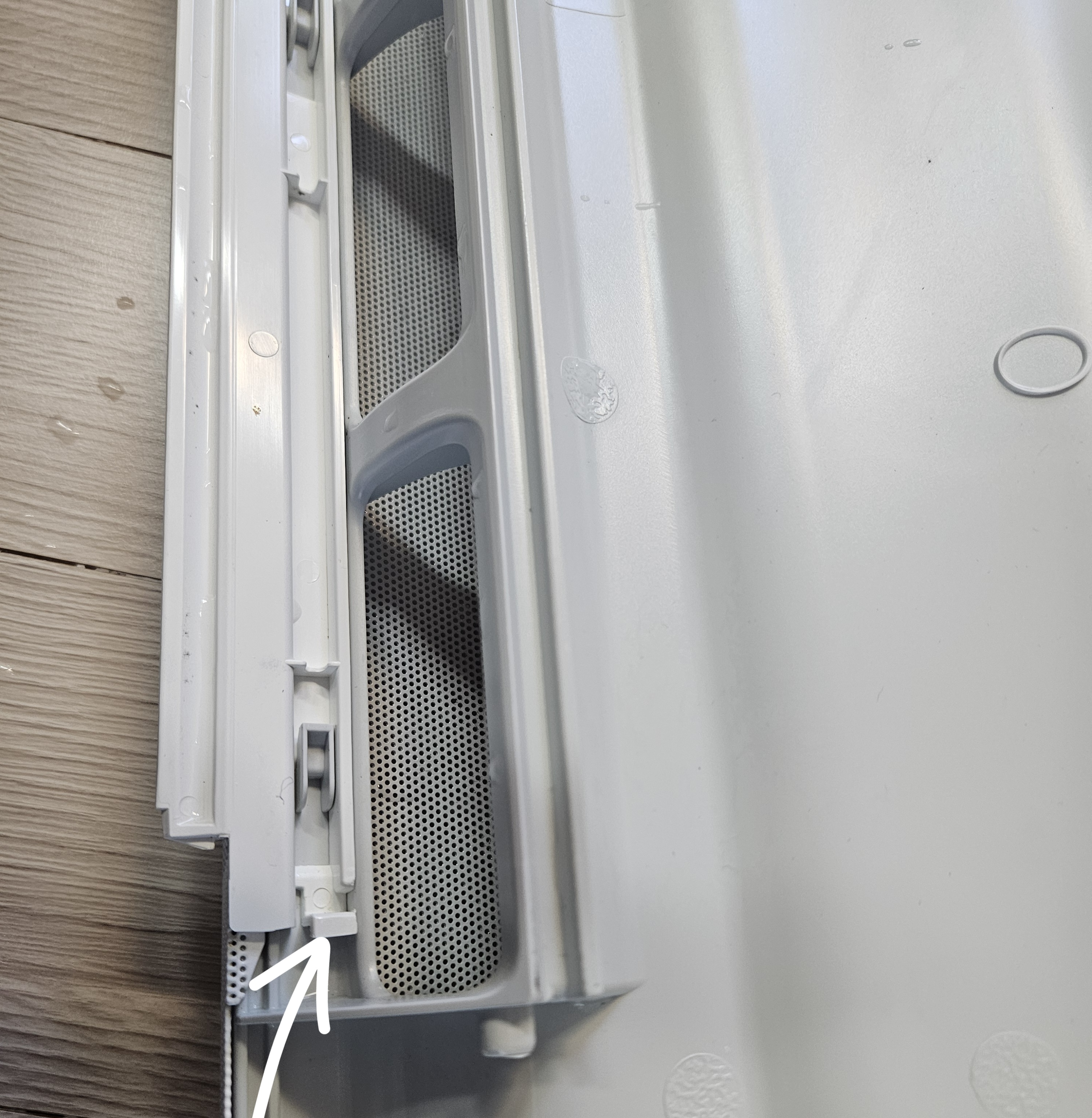 ▼그다음 하단 커버를 분리한 부분과 패널 하단 부분에 틈이 있을 겁니다. 거기에 한 손을 넣어주고 다른 한 손은 패널을 잡고 위로 밀면 패널이 빠질 겁니다. 뺀 패널은 세제를 이용해 청소해 주면 됩니다.