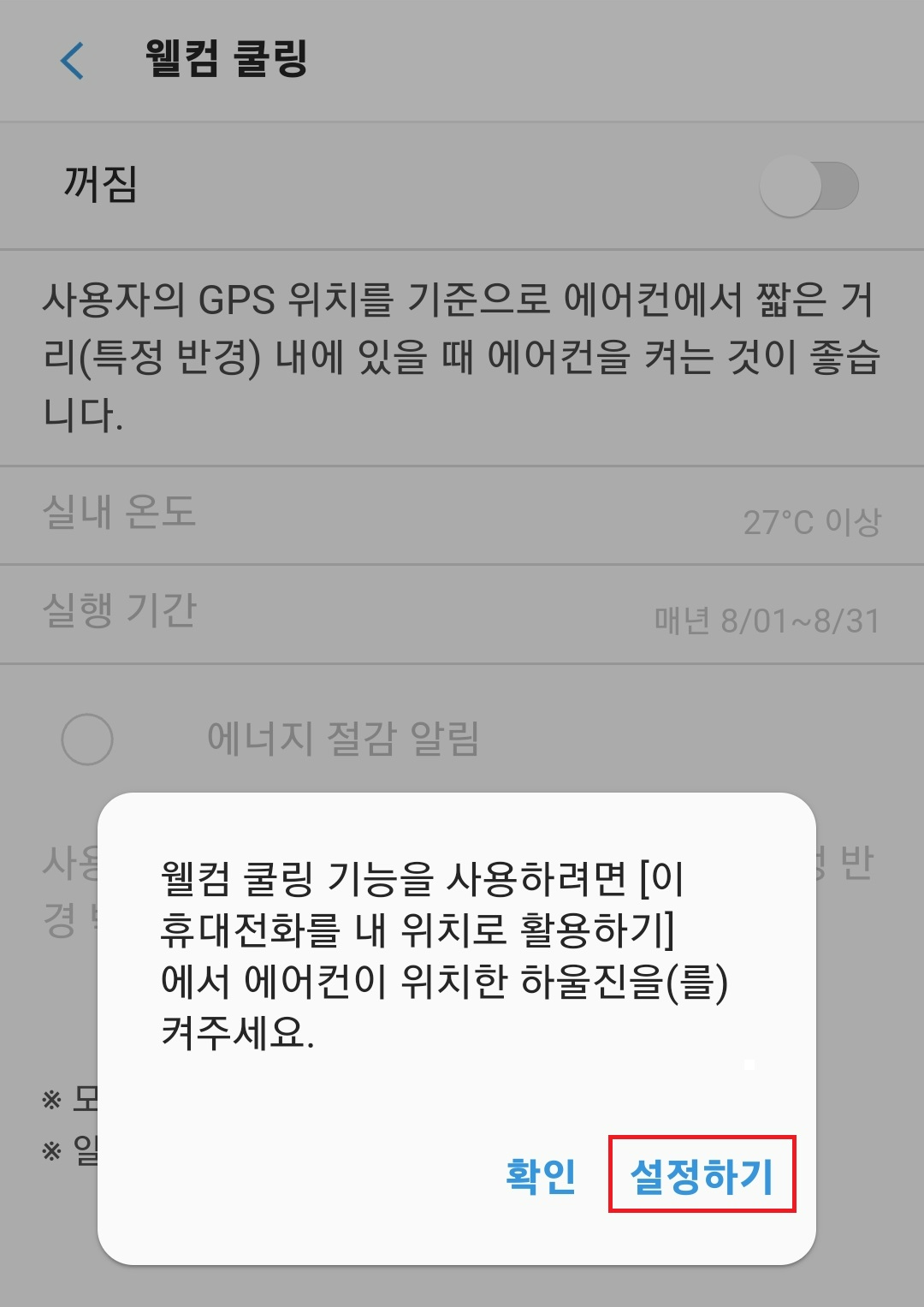 그다음 웰컴 쿨링 기능이 꺼져있을걸 활성화시켜줍니다. 그럼  "웰컴 쿨링 기능을 사용하려면 [이 휴대전화를 내 위치로 활용하기]에서 에어컨이 위치한 하울진을 켜주세요"라는 문구가 뜰 수도 있습니다. 그럼 당황하지 마시고 설정하기를 클릭해줍니다.