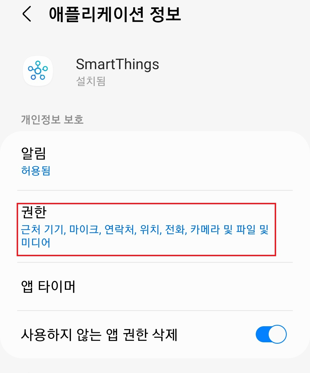 그럼 Smart Things 애플리케이션 정보로 넘어가지고 개인정보 보호란에서 "권한"을 클릭하고 "위치"를 클릭해줍니다.