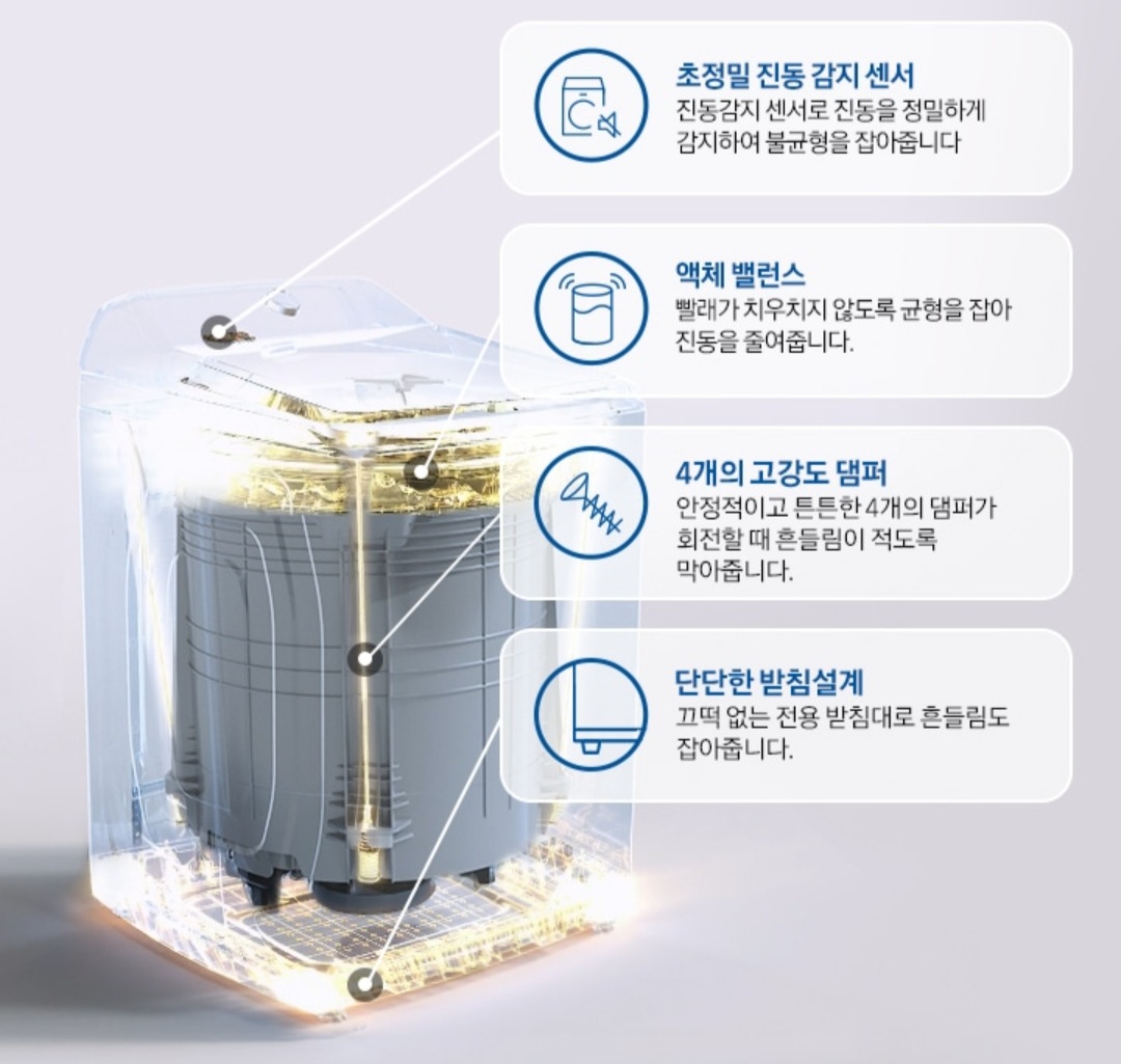 늦은 저녁 정말 어쩔 수 없이 세탁을 해야 할 때 세탁기 소음이 크게 날까 봐 세탁하기 두려웠다면 삼성 그랑데 통버블 세탁기는 4중 진동 저감 장치로 늦은 밤 세탁 걱정을 덜어준다고 합니다. 초정밀 진동 감지 센서로 진동을 정밀하게 감지하여 불균형을 잡아주고 액체 밸런스로 빨래가 치우치지 않게 균형을 잡아 진동을 줄어준다고 합니다 거기에 4개의 고강도 댐퍼로 통이 회전할 때 흔들림이 적도록 막아주고 단단한 받침 설계로 흔들림도 잡아준다고 합니다.