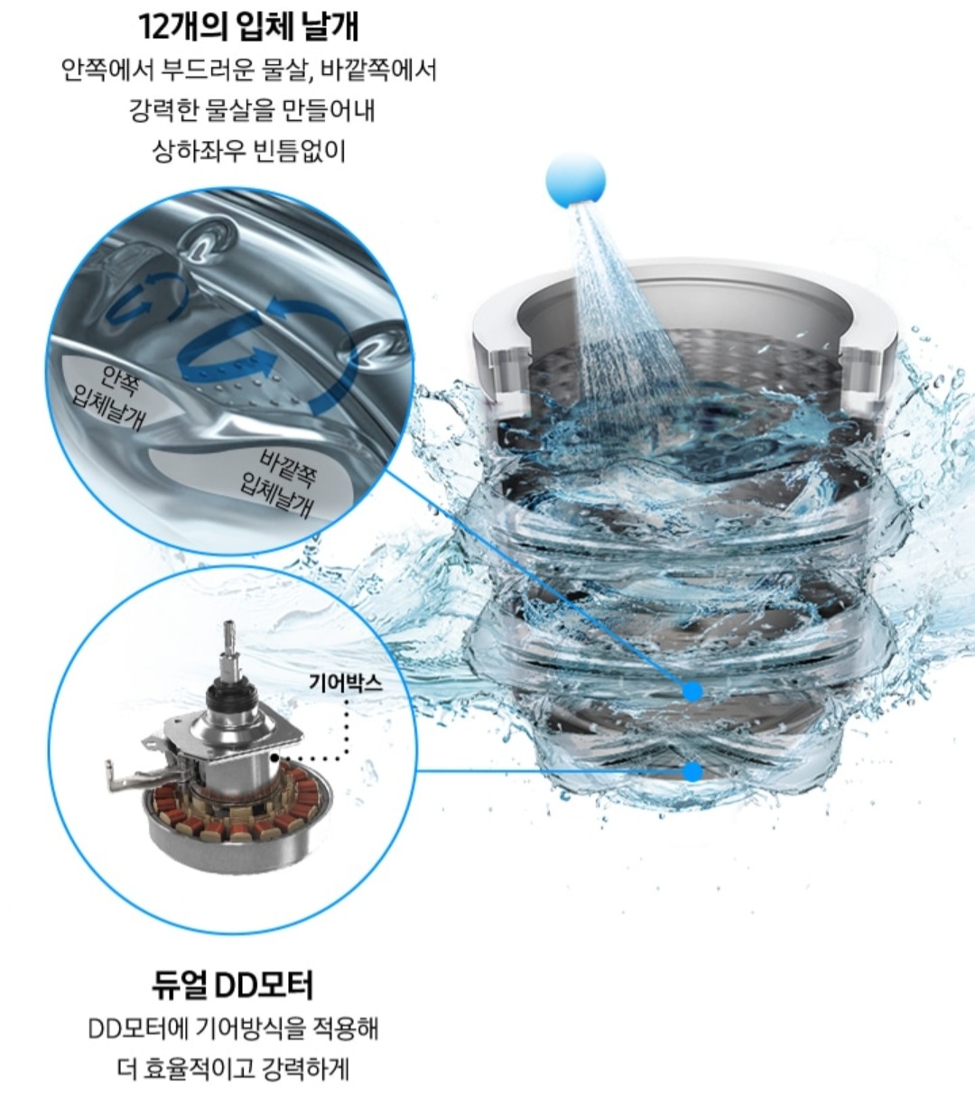 삼성 그랑데 통 버블 세탁기는 위에서 분사되는 제트 샷 기술로 세탁물의 찌든 때를 제거해주는 걸 도와주고 세탁 시간을 약 2분의 1로 줄여줘 30분 만에 세탁이 완료된다고 합니다. 거기에 듀얼 DD 모터와 세탁조 하단의 12개 입체 날개로 안쪽은 부드러운 물살을 바깥쪽에서는 강력한 물살을 만들어주기 때문에 세탁력도 좋아졌다고 합니다.