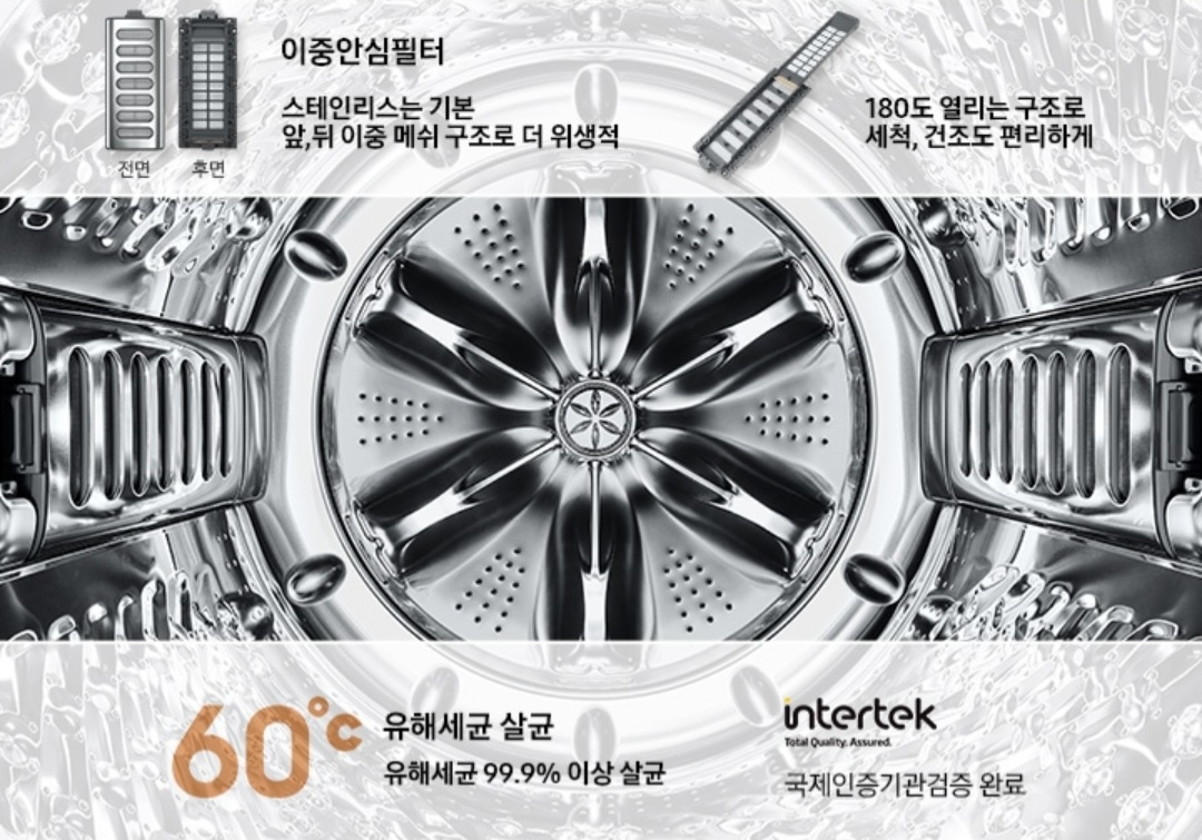 삼성 그랑데 통버블 세탁기 세탁통 및 이중 안심 필터 또한 스테인리스로 구성되어있어 대용량의 먼지를 꽉 잡아주고 통풍이 잘되는 구조로 위생적으로 사용이 가능하고 필터도 180도로 열리는 구조라서 세척, 건조도 편리하게 구성되어있습니다. 그리고 유해세균을 99.9% 잡아주는 살균세탁 기능도 있습니다.
