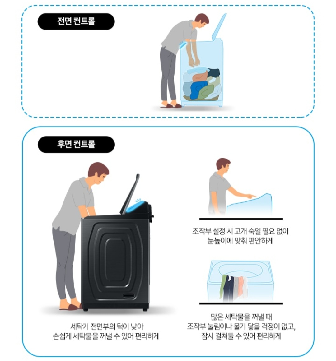 일반적인 통돌이 세탁기 조작부는 대부분 앞면에 있었다면 삼성 그랑데 통버블 세탁기는 조작부가 후면에 위치해 세탁기 전면부의 턱이 낮아 세탁물을 꺼낼 때 조금 더 편리하게 꺼낼 수 있고 조작부 후면에 있어 눈높이에 맞춰 편안하게 조작할 수도 있습니다. 거기에 세탁물을 꺼낼 때 앞면에 조작부가 없어 잠시 세탁물을 걸쳐둘 수 있게 제작되었다고 합니다.
