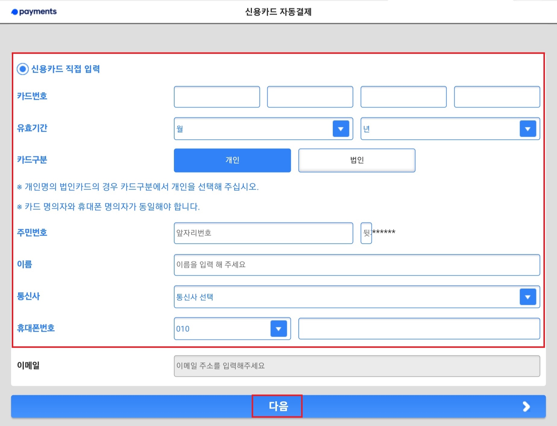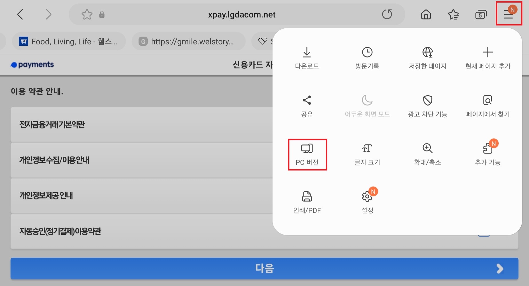 결제하기를 클릭하면 신용카드 자동결제창으로 넘어지면서 약관 동의가 뜹니다. 그럼 전체 동의를 하기 전에 더보기를 클릭하고 PC버전으로 변경 후 전체 동의해주시고 카드정보 등록 및 결제카드 개인정보 등록 후 다음을 클릭합니다.