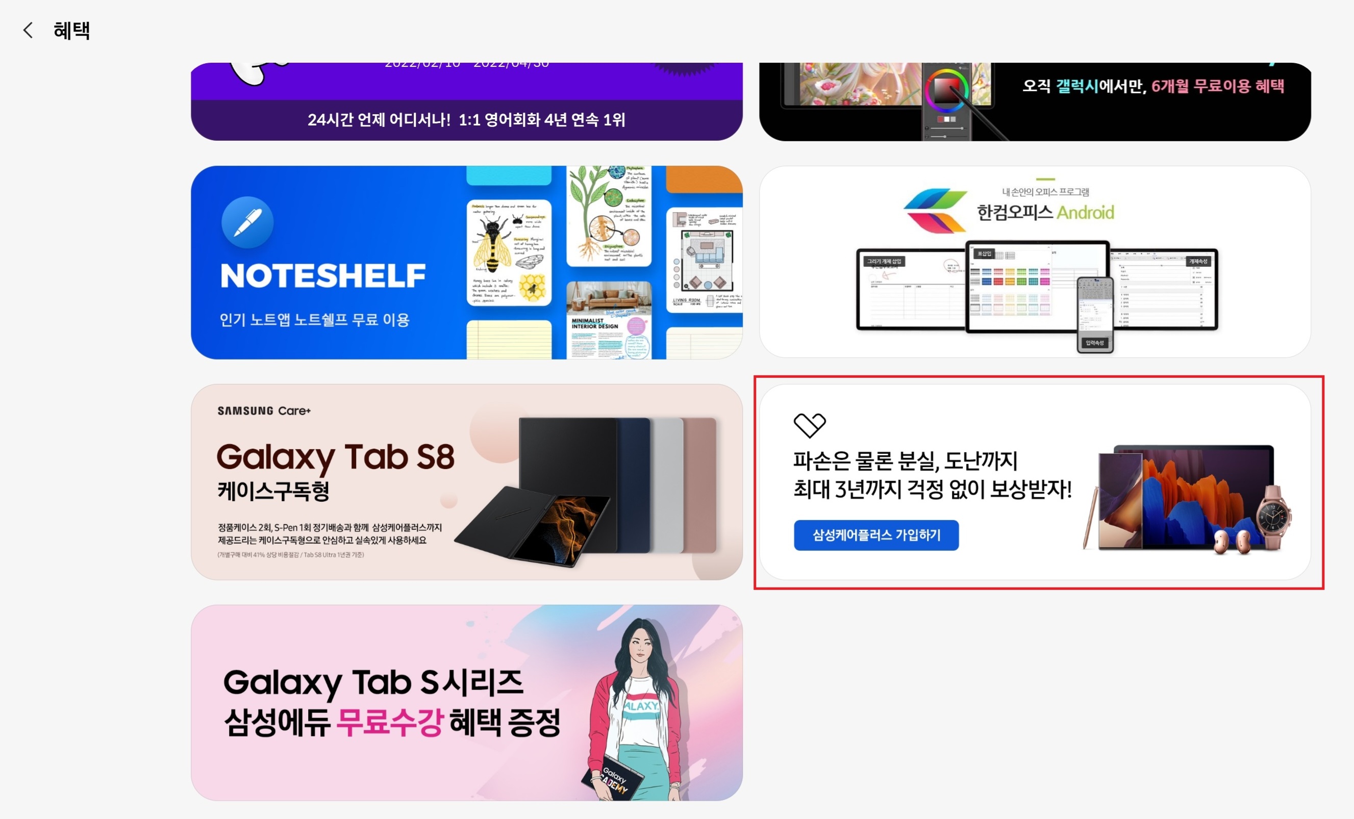 우선 스마트폰이나 갤럭시탭을 구매했다면 삼성 어플인 "Samsung Members" 앱을 다운로드한 다음 삼성 계정 로그인을 해줍니다 그다음 스크롤을 내리다보면 혜택란이 보입니다. 그럼 혜택란을 클릭하면 "삼성 케어 플러스 가입하기"가 보이는데 그걸 클릭해줍니다.