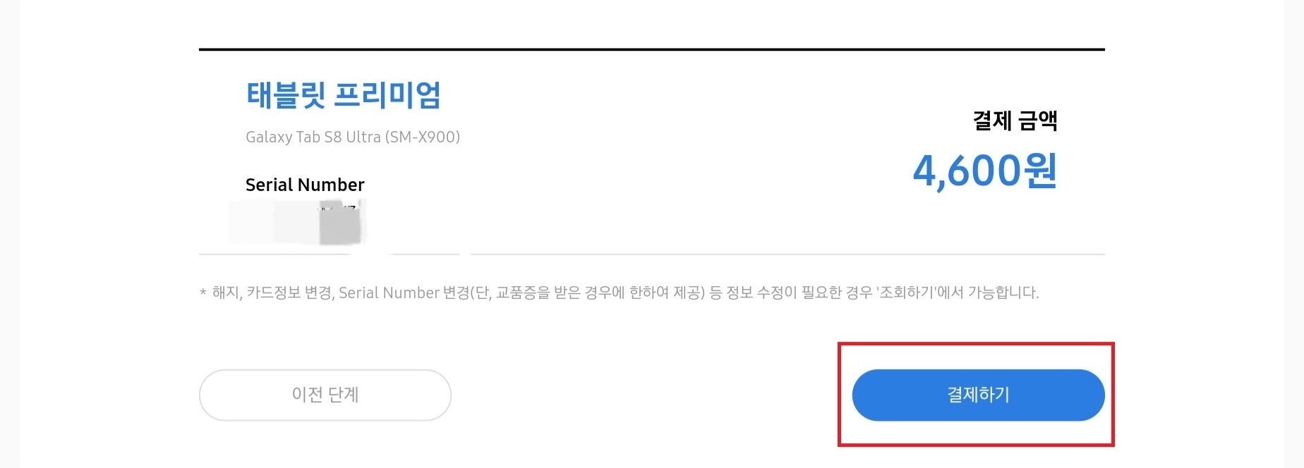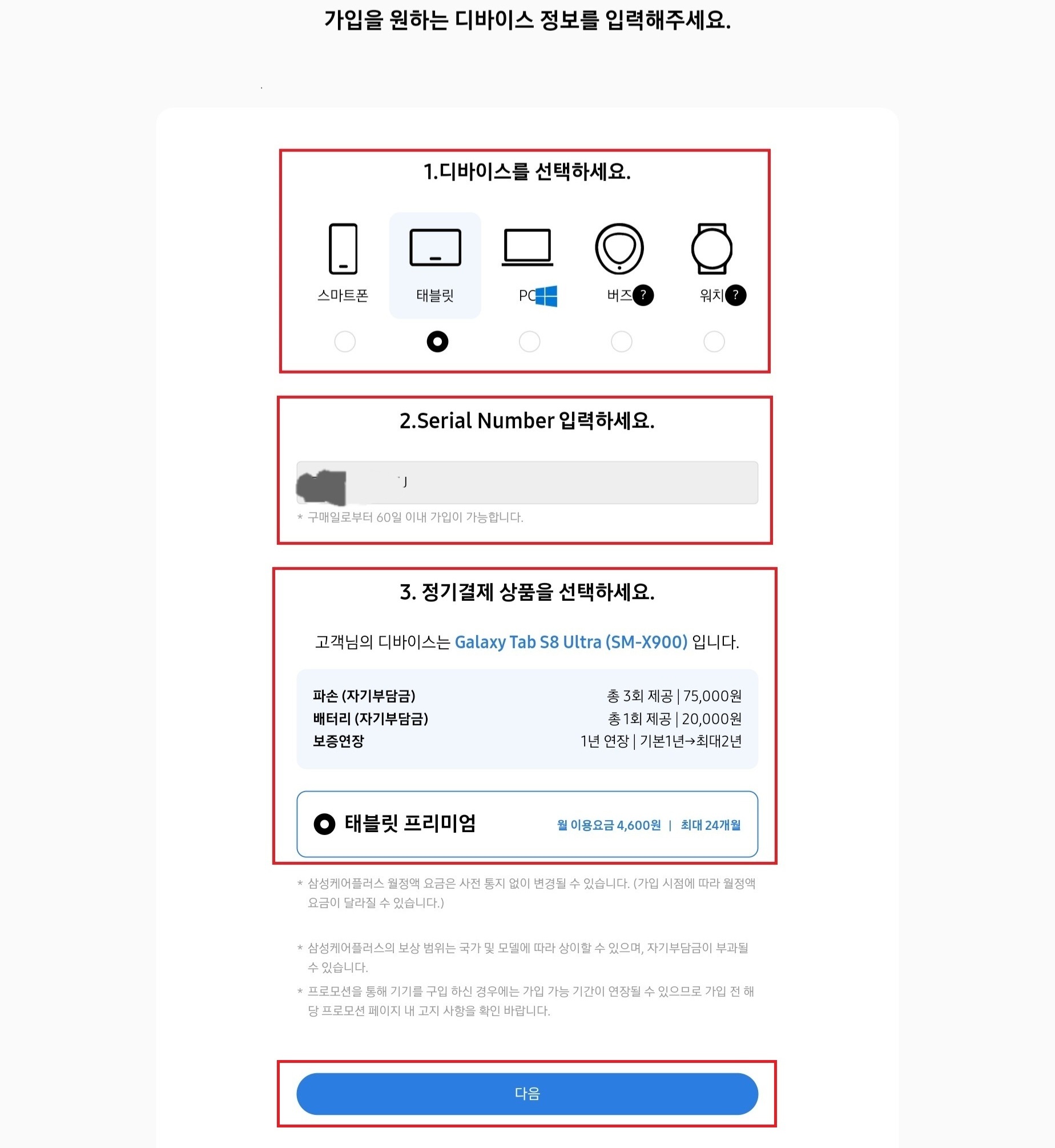 가입하기를 클릭하면 상품 선택을 하게 되어있습니다. 앞서 말씀드렸다시피 저는 갤럭시탭 S8 시리즈를 구매해서 태블릿을 선택하였고 제품 시리얼 넘버를 작성 후 태블릿 프리미엄 월 요금 4,600원 내는 걸 선택했습니다.