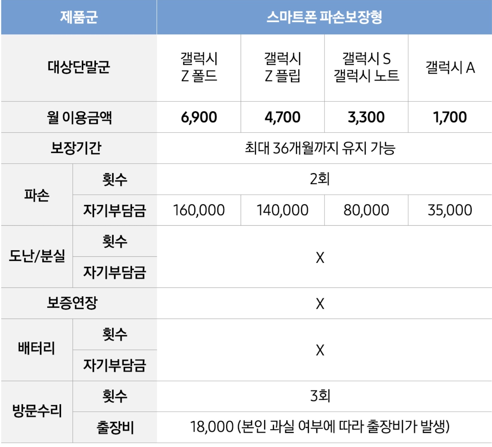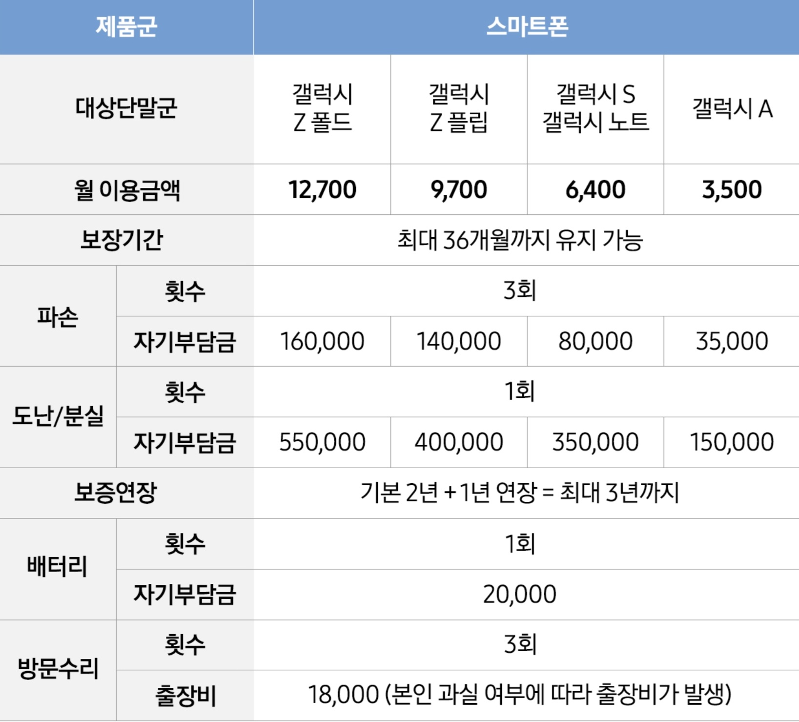 3) 삼성 케어 플러스 월정책 요금은 사전 통지 없이 변경될 수도 있습니다. (가입 시점에 따라 월 정액 요금이 달라질 수 있습니다)