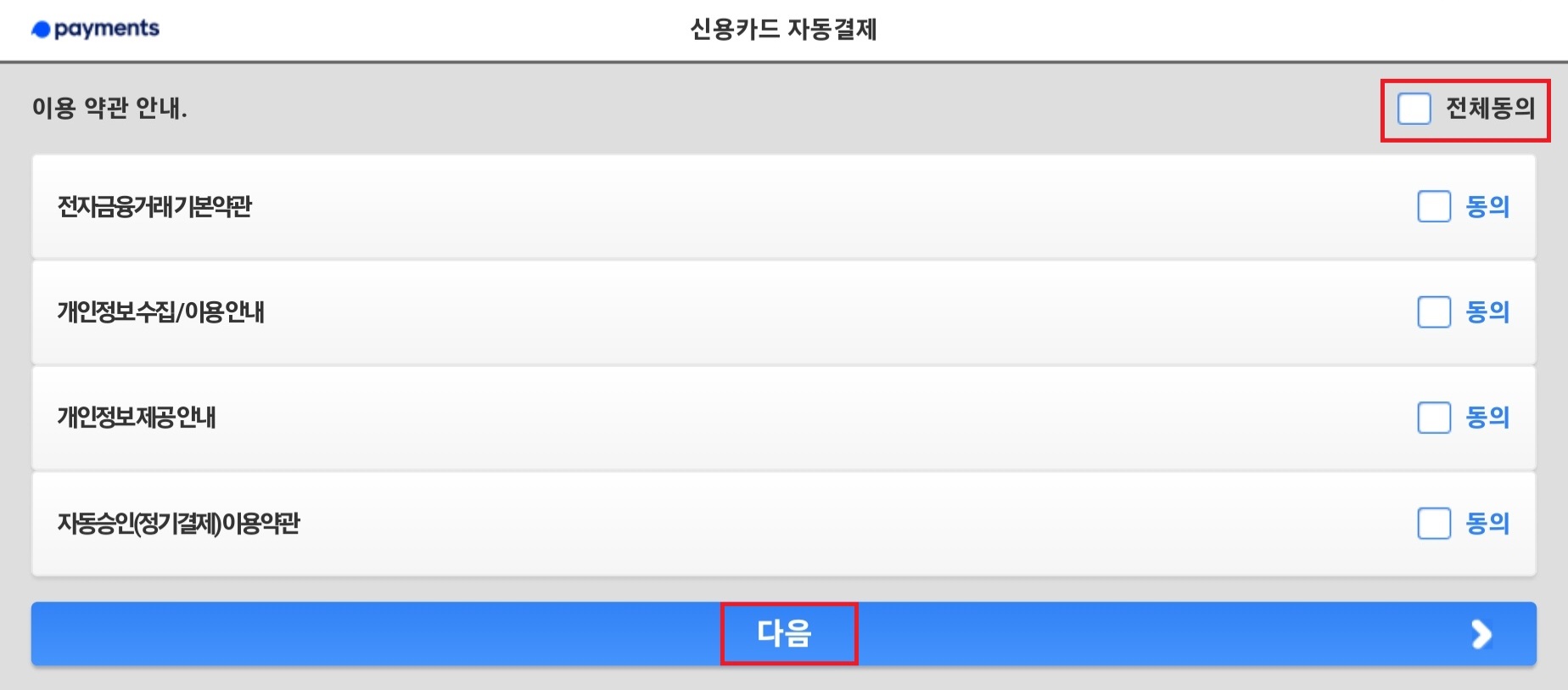 결제하기를 클릭하면 신용카드 자동결제창으로 넘어지면서 약관 동의가 뜹니다. 그럼 전체 동의를 하기 전에 더보기를 클릭하고 PC버전으로 변경 후 전체 동의해주시고 카드정보 등록 및 결제카드 개인정보 등록 후 다음을 클릭합니다.