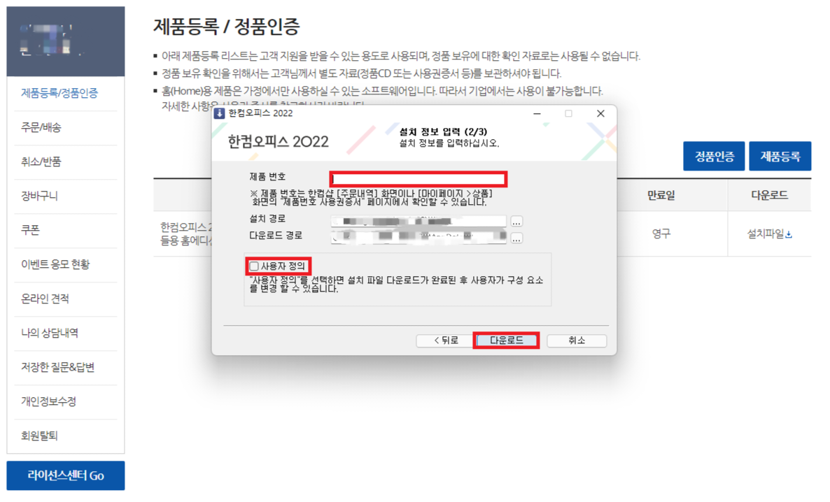 그다음 "위 사항에 동의합니다" 체크하고 "다음"을 클릭하고 제품번호에 아까 복사한 시리얼 넘버를 붙여 넣기 한 다음 "사용자 정의"를 체크하고 다운로드를 해주면 됩니다.
