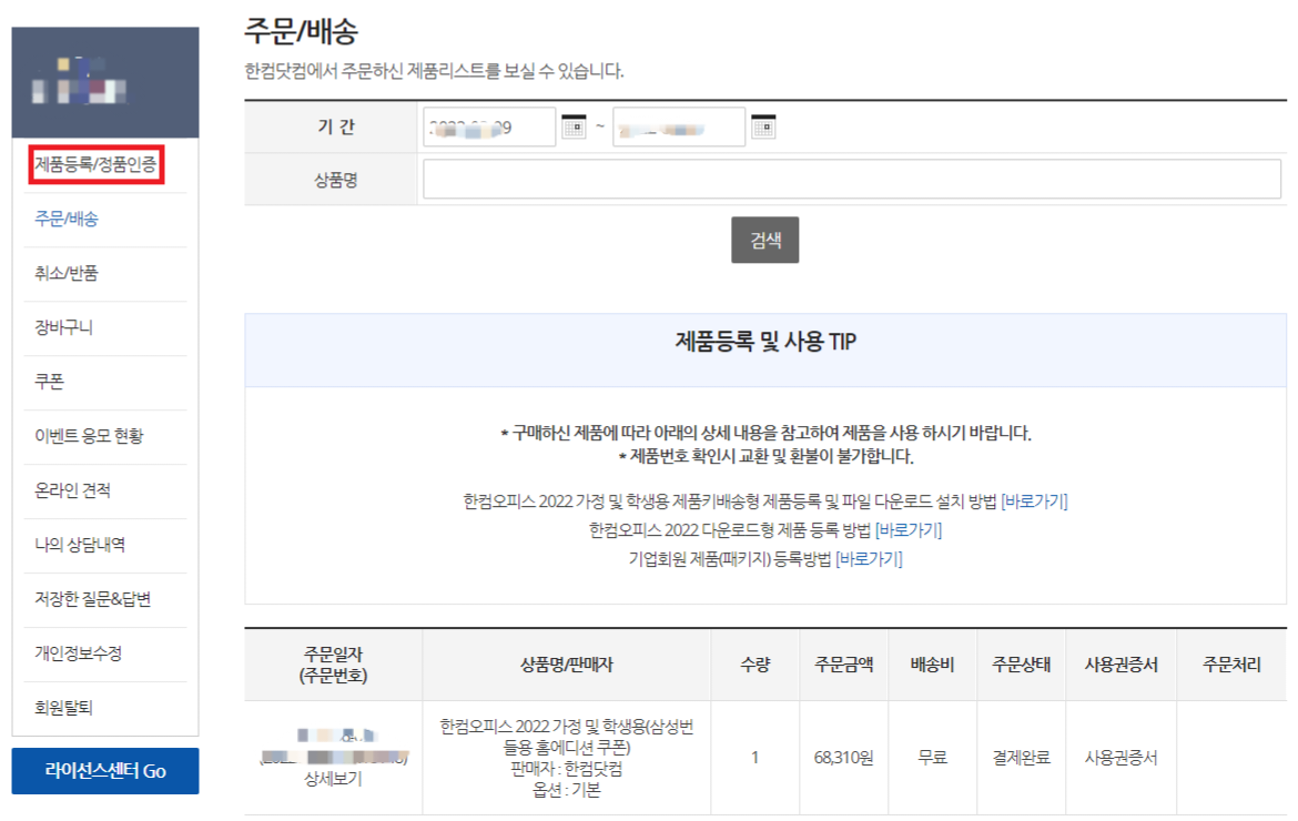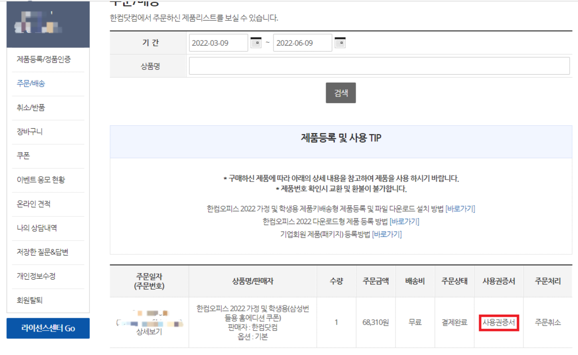 결제하기를 클릭했다면 그다음으로 "주문 내역 확인하기"를 클릭하고 "사용권 증서"를 클릭해줍니다.